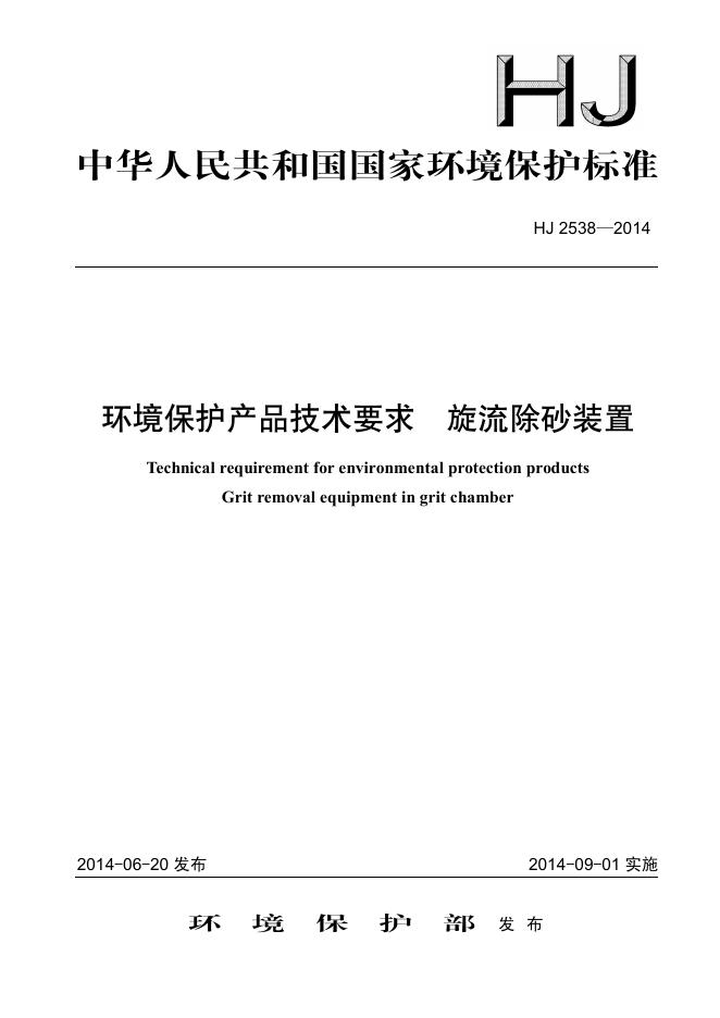 HJ 2538-2014 环境保护产品技术要求 旋流除砂装置