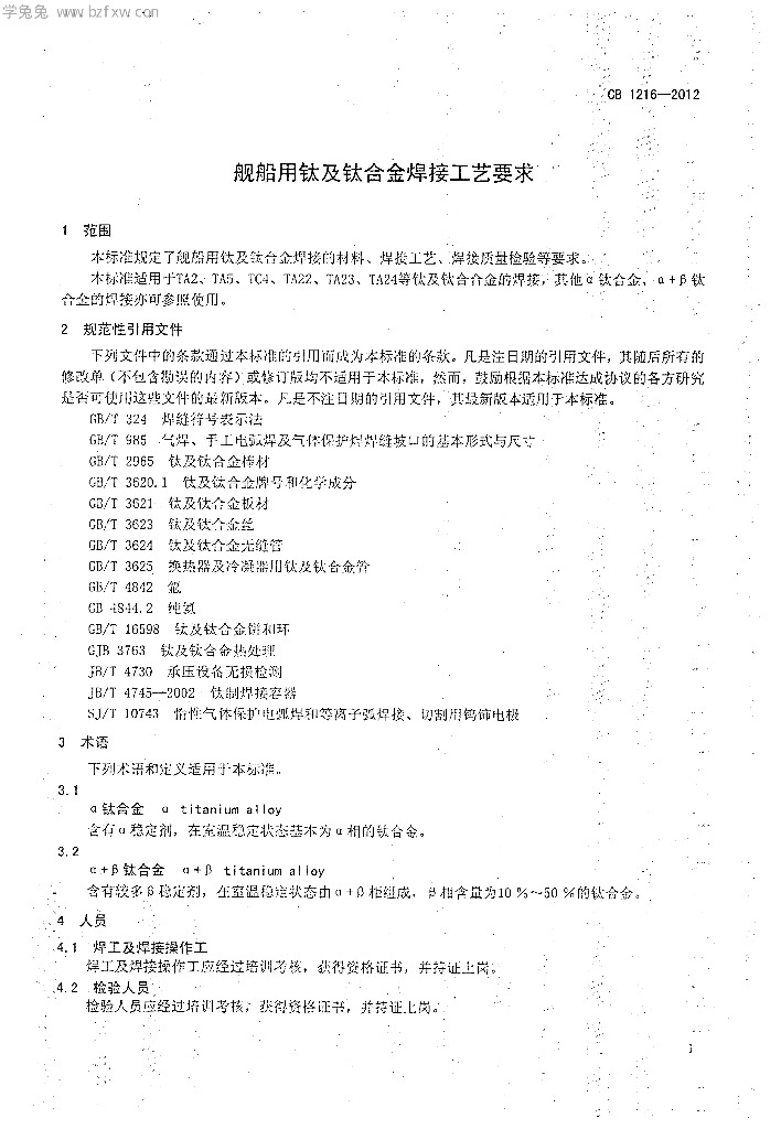 CB 1216-2012 舰船用钛及钛合金焊接工艺要求