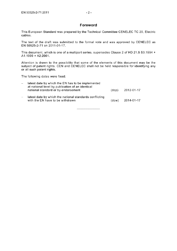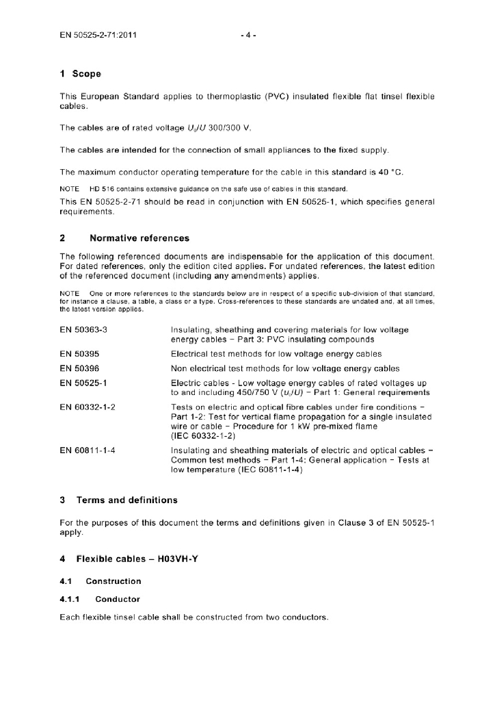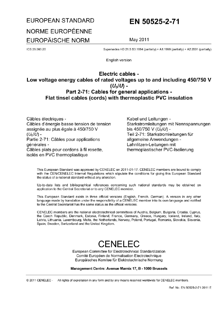 EN 50525-2-71:2011 额定电压455/750V及以下低压节能电缆 - 第2-71部分 通用电缆 - 带有热塑性聚氯乙烯绝缘的扁平铜皮软电缆(软线)