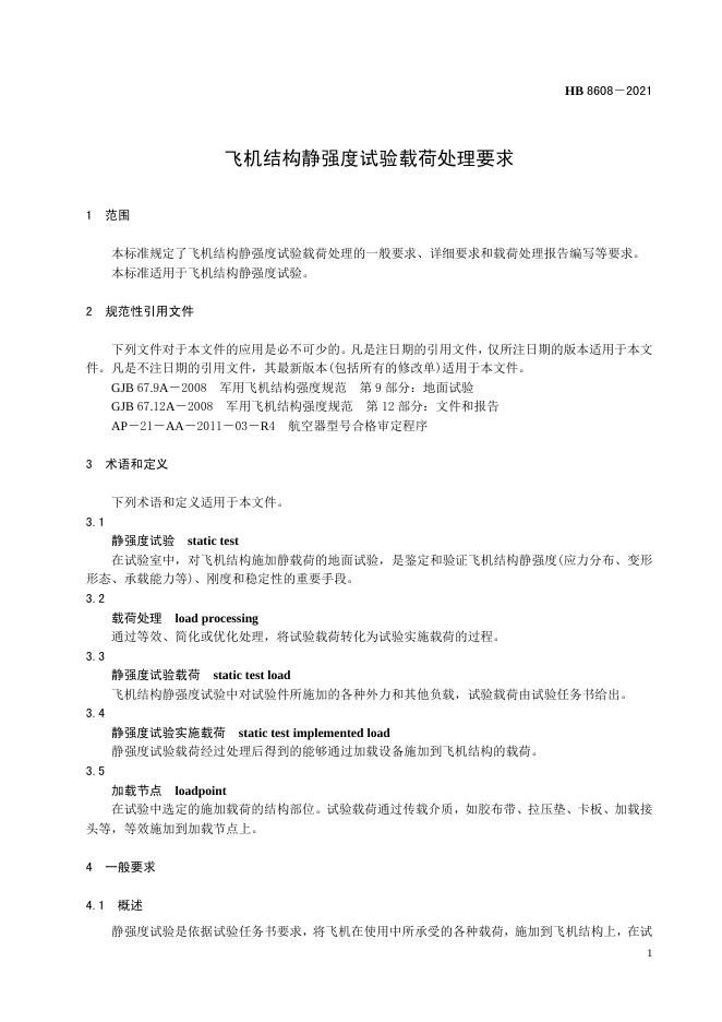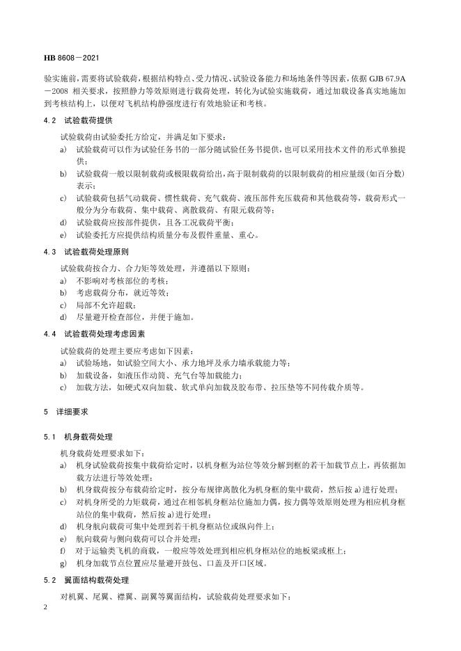 HB 8608-2021 飞机结构静强度试验载荷处理要求