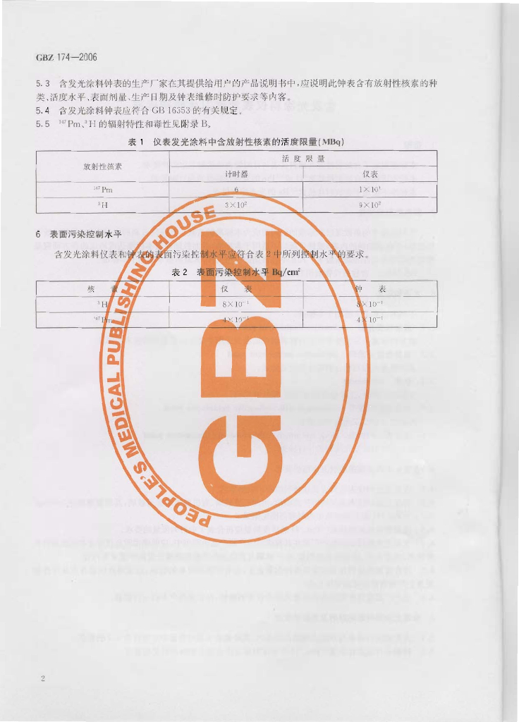 GBZ 174-2006 含发光涂料仪表放射卫生防护标准