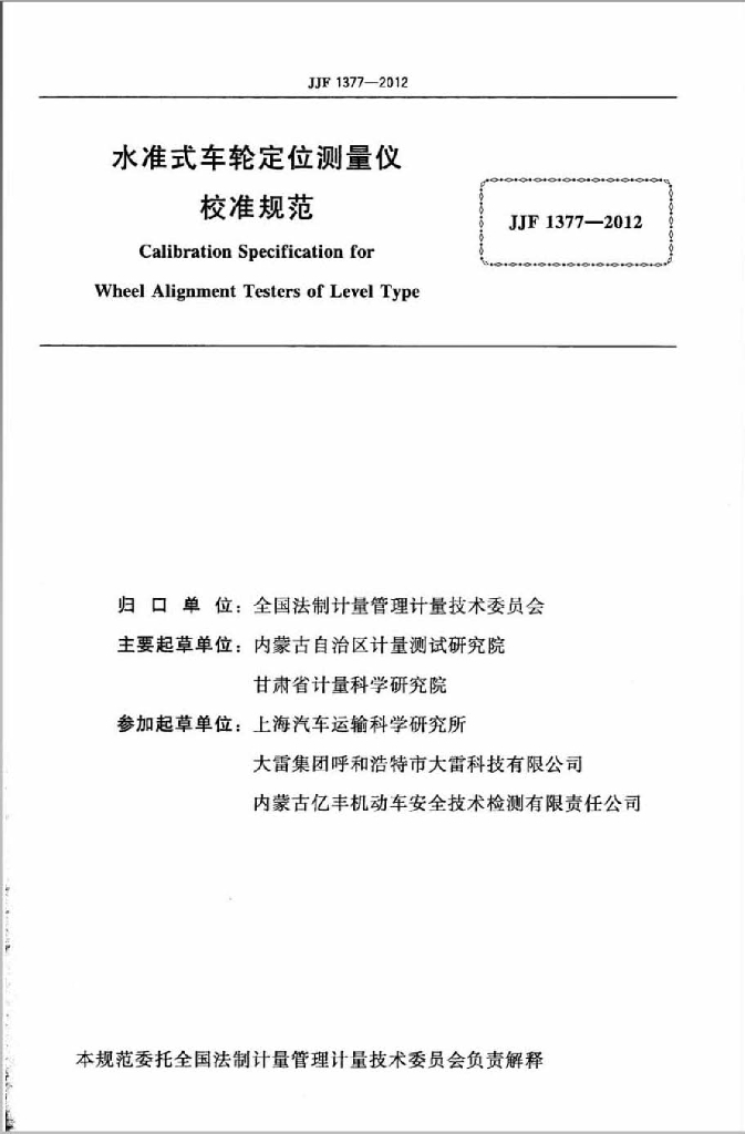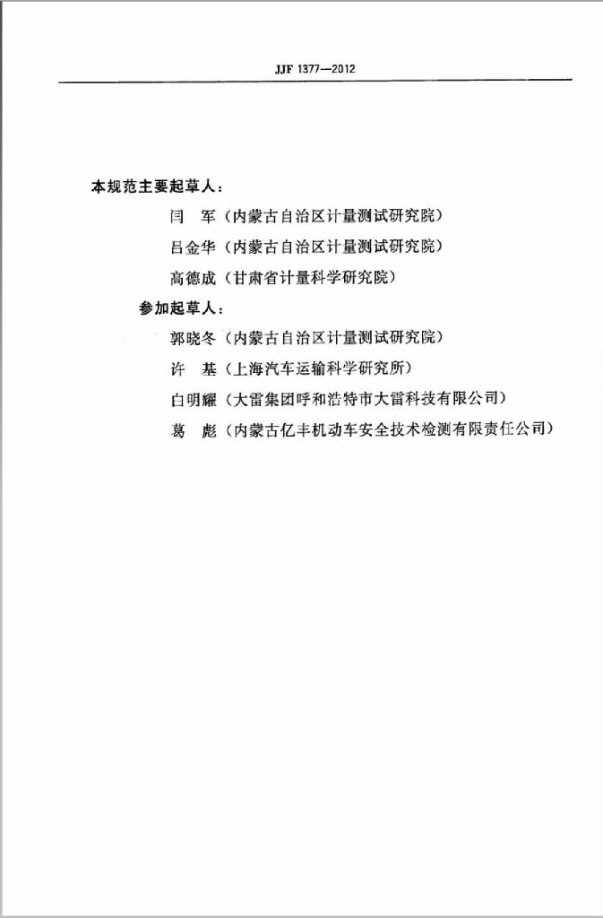 闫军(内蒙古自治区计量测试研究院)、吕金华(内蒙古自治区计量测试研究院)、高德成(甘肃省计量科学研究院)、郭晓冬(内蒙古自治区计量测试研究院)、许基(上海汽车运输科学研究所)、白明耀(大雷集团呼和浩特市大雷科技有限公司)、葛彪(内蒙古亿丰机动车安全技术检测有限责任公司)