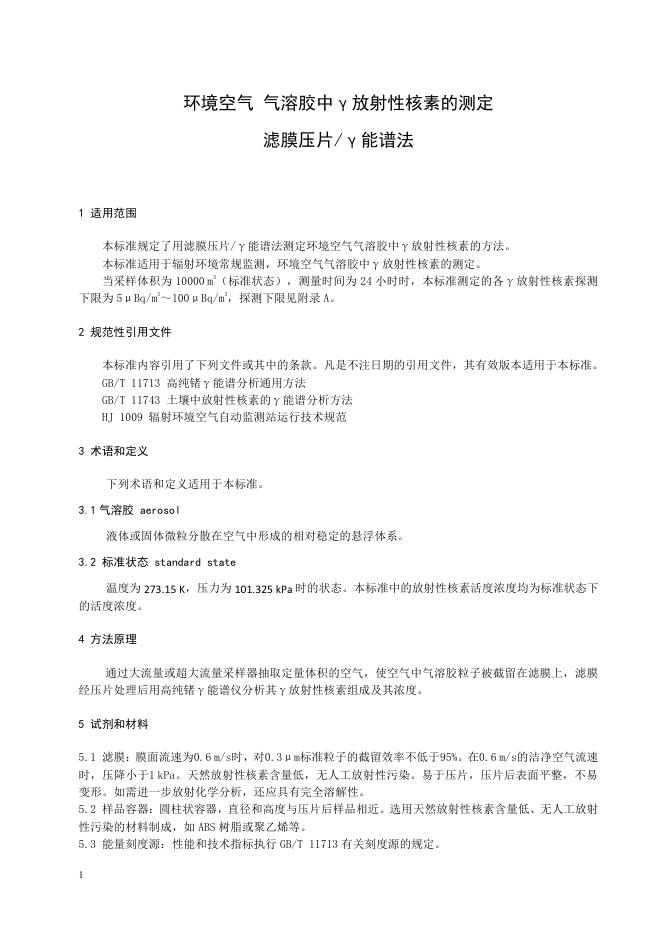 HJ 1149-2020 环境空气 气溶胶中γ放射性核素的测定 滤膜压片/γ能谱法