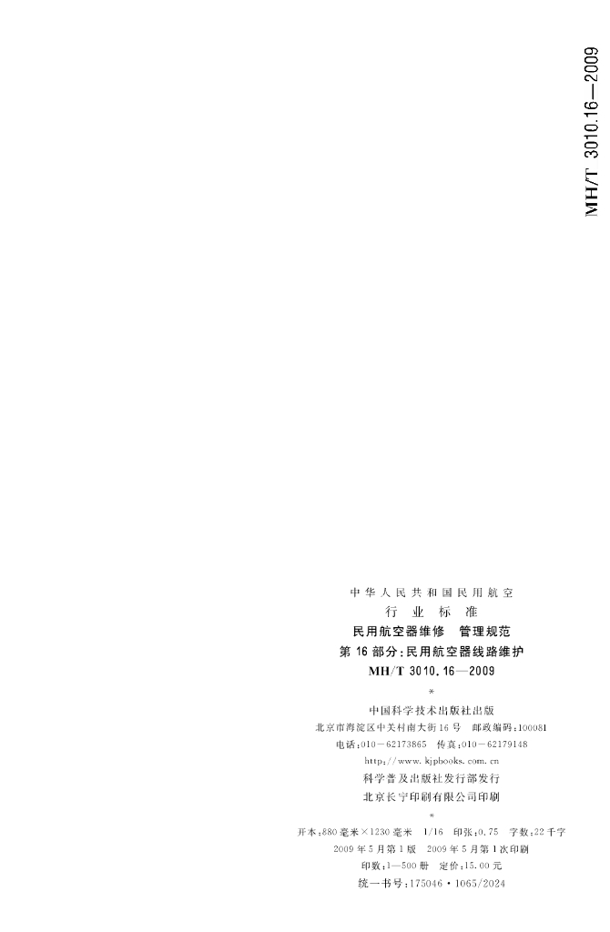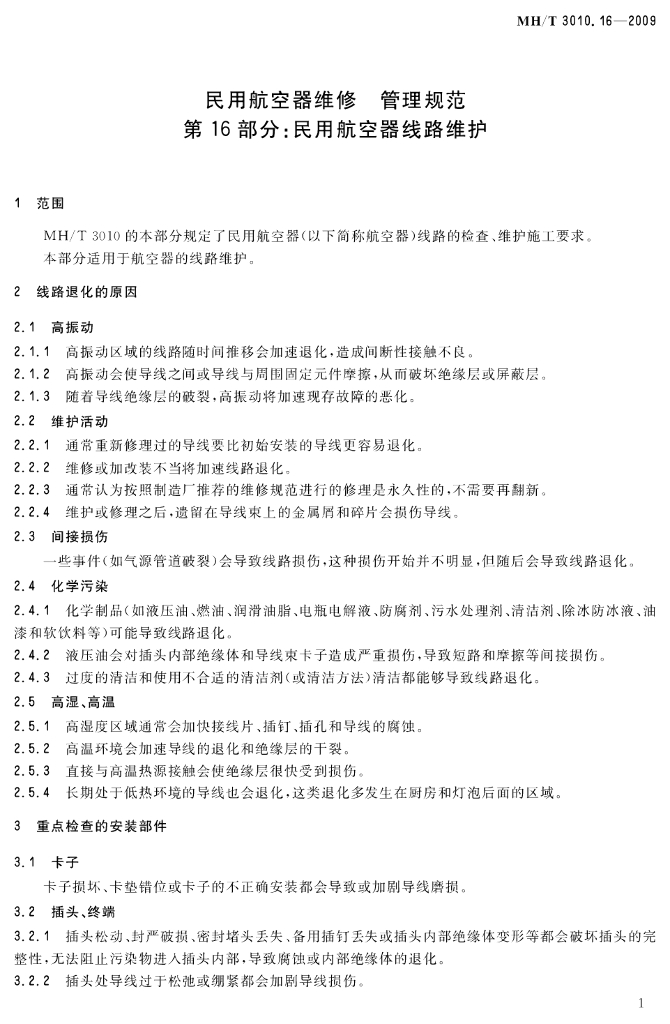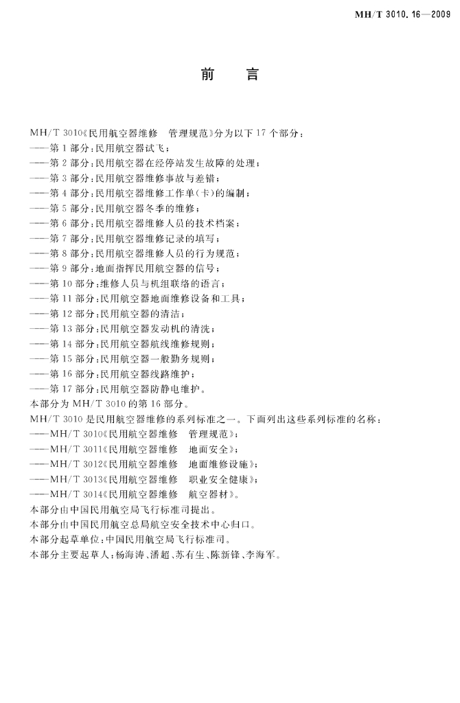 MH/T 3010.16-2009 民用航空器维修 管理规范 第16部分:民用航空器线路维护