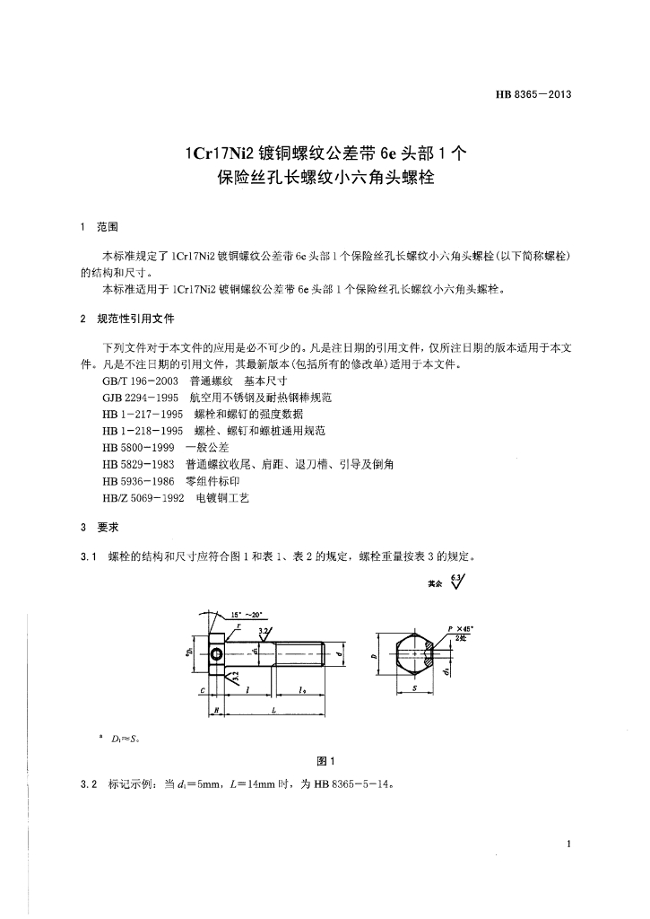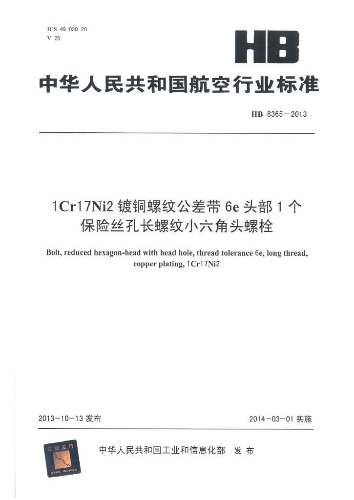 HB 8365-2013 1Cr17Ni2镀铜螺纹公差带6e头部1个保险丝孔长螺纹小六角头螺栓