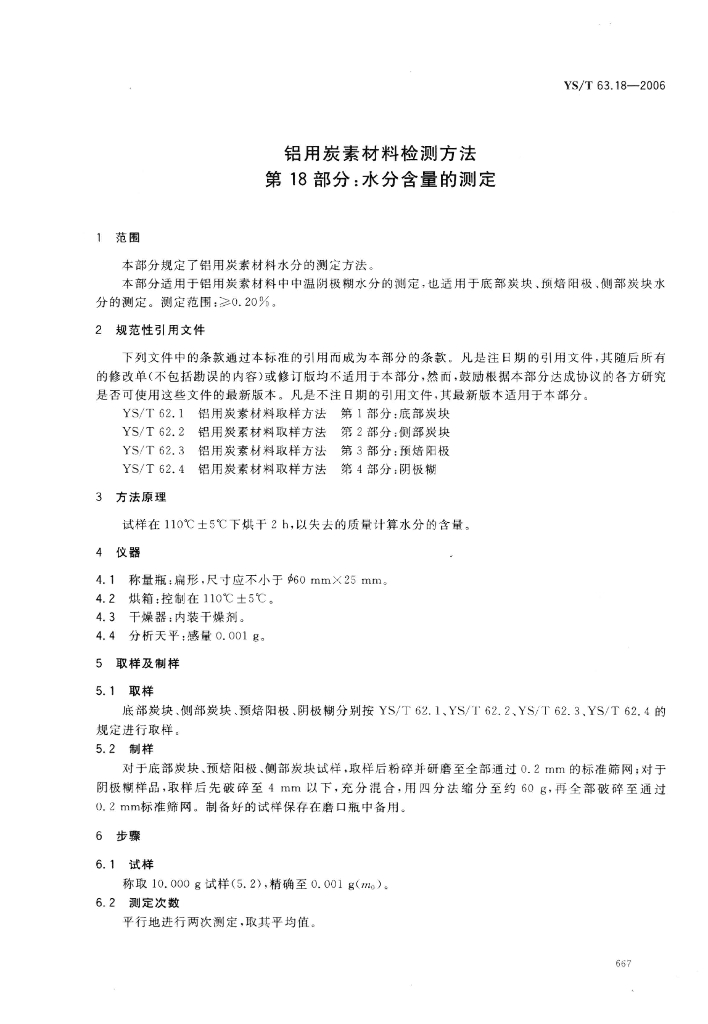 YS/T 63.18-2006 铝用炭素材料检测方法 第18部分:水分含量的测定