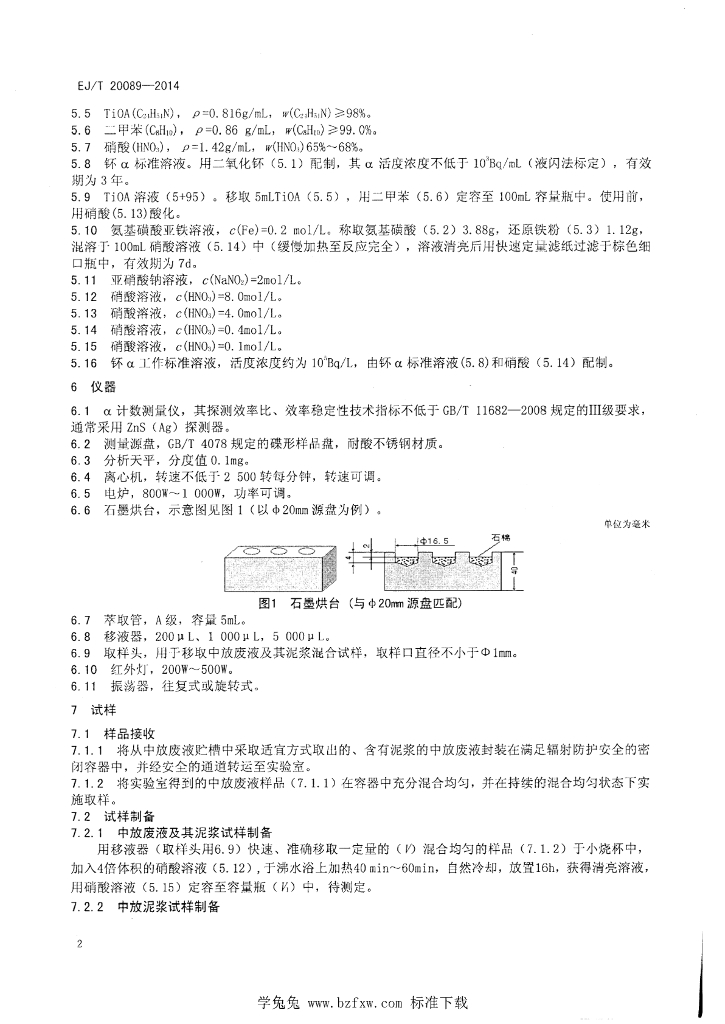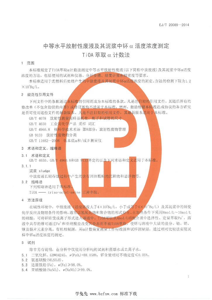 EJ/T 20089-2014 中等水平放射性废液及其泥浆中钚α活度浓度的测定 TioA 萃取α计数法