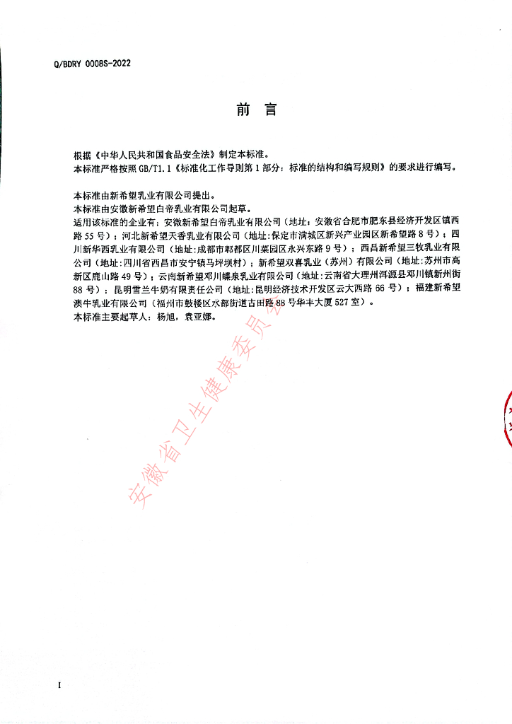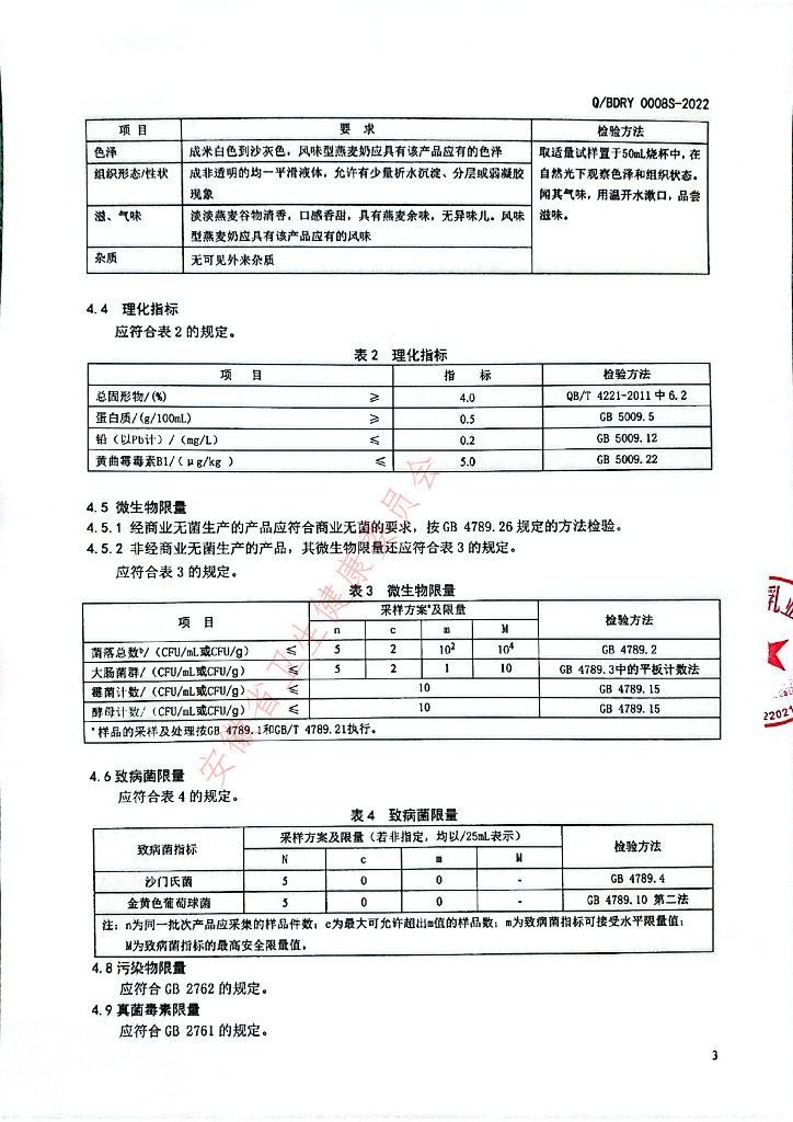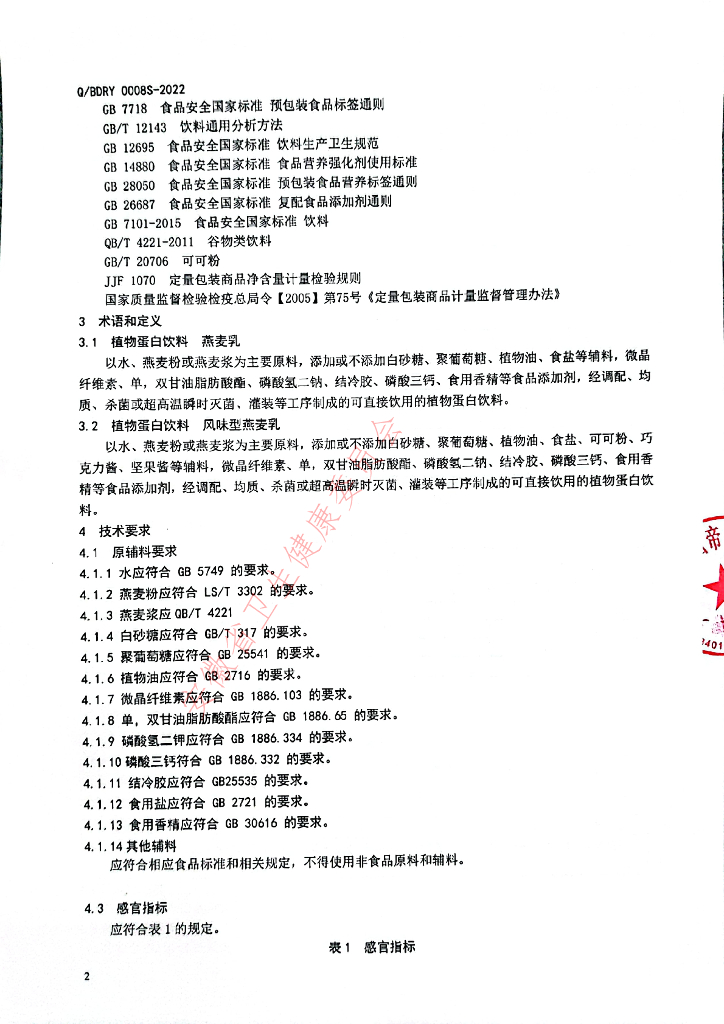 Q/BDRY 0008S-2022 燕麦奶(植物蛋白饮料)