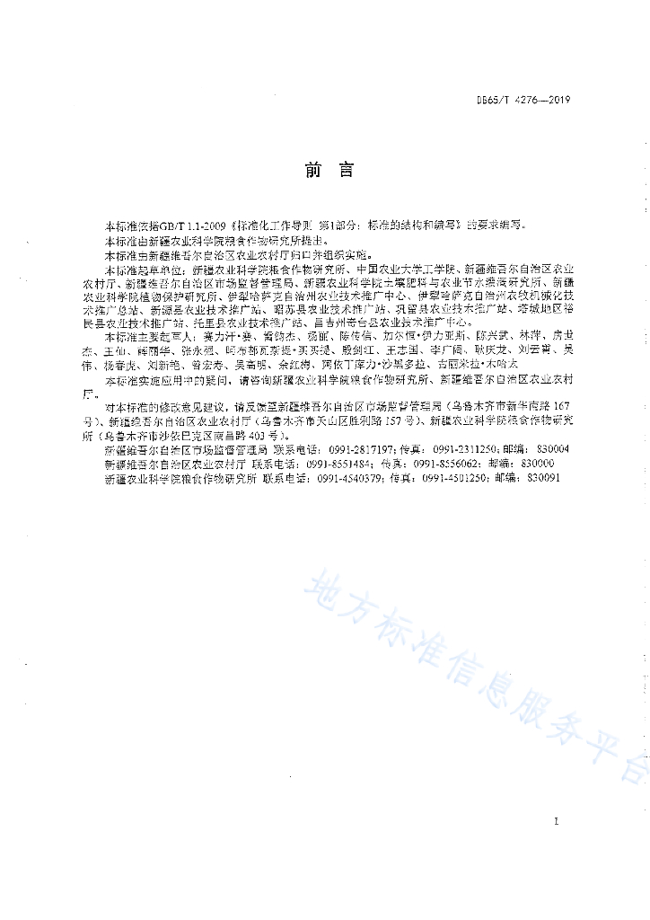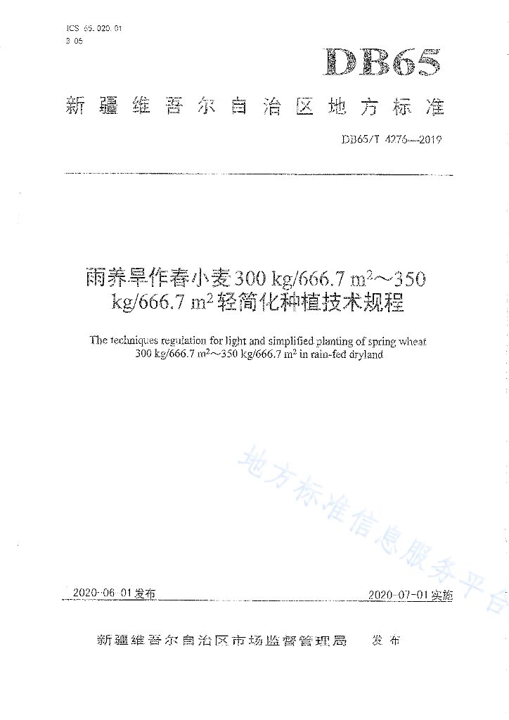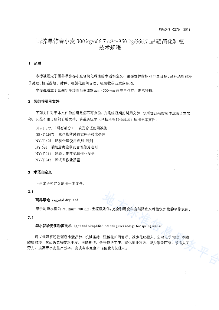 DB65/T 4276-2019 雨养旱作春小麦300㎏/666.7㎡~350㎏/666.7㎡轻简化种植技术规程