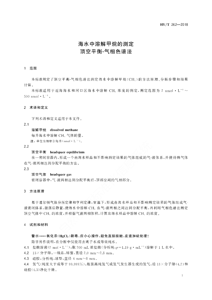 HY/T 262-2018 海水中溶解甲烷的测定 顶空平衡-气相色谱法