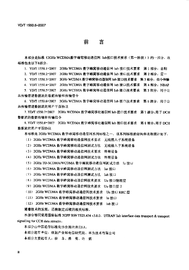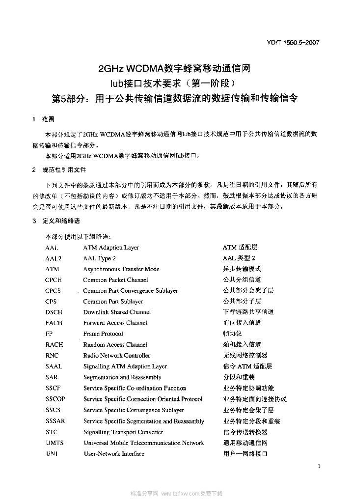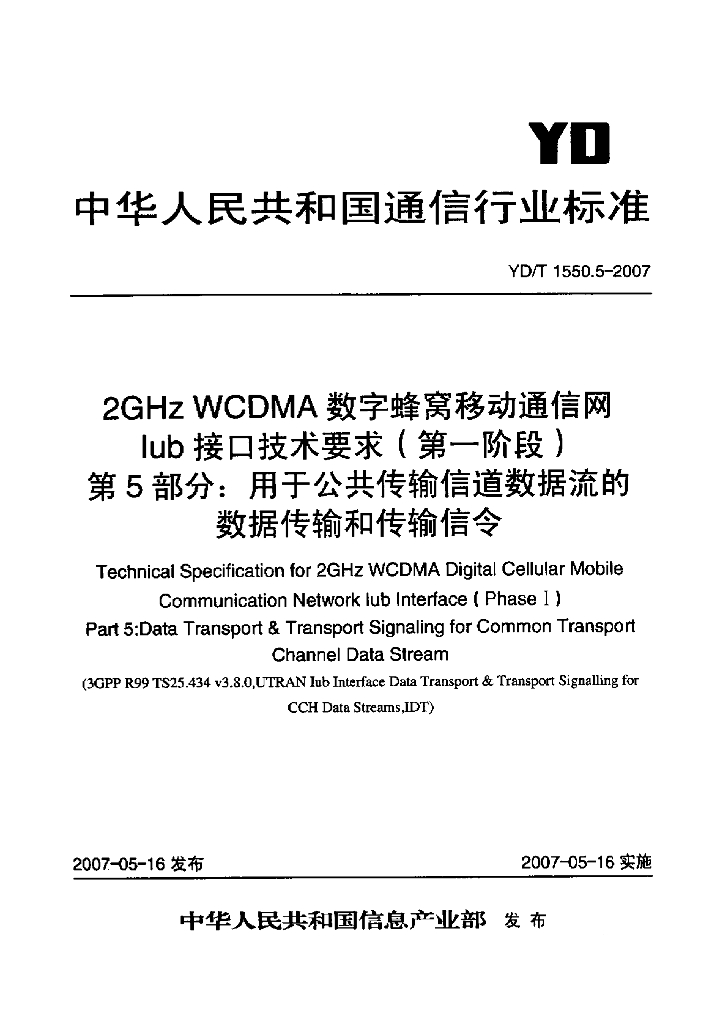 YD/T 1550.5-2007 2GHz WCDMA 数字蜂窝移动通信网 lub 接口技术要求(第一阶段) 第5部分:用于公共传输信道数据流的数据传输和传输信令