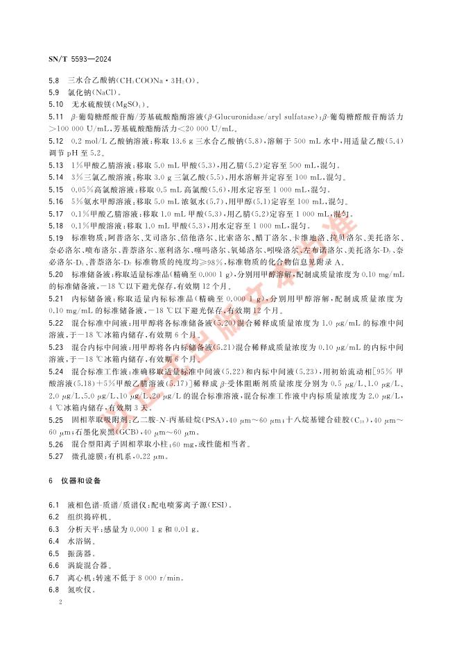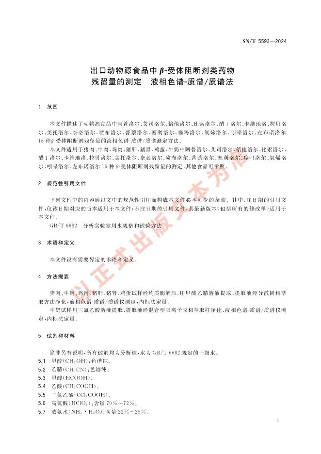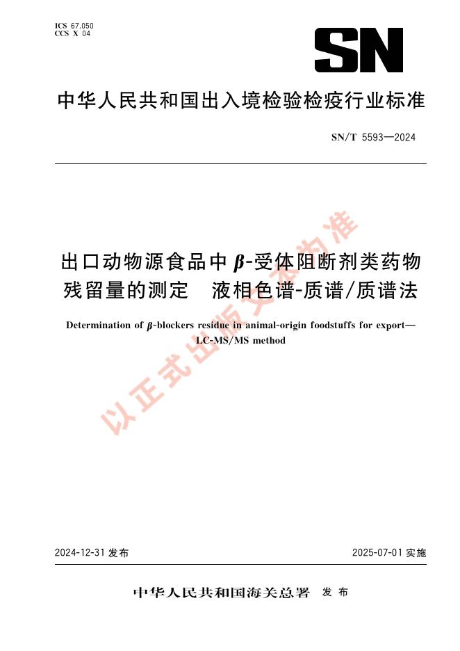 SN/T 5593-2024 出口动物源食品中β-受体阻断剂类药物残留量的测定 液相色谱-质谱/质谱法