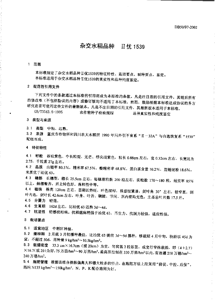 DB50/ 97-2002 杂交水稻品种 Ⅱ优1539