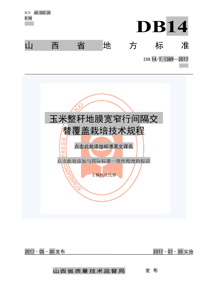 DB14/T 1389-2017 玉米整秆地膜宽窄行间隔交替覆盖栽培技术规程