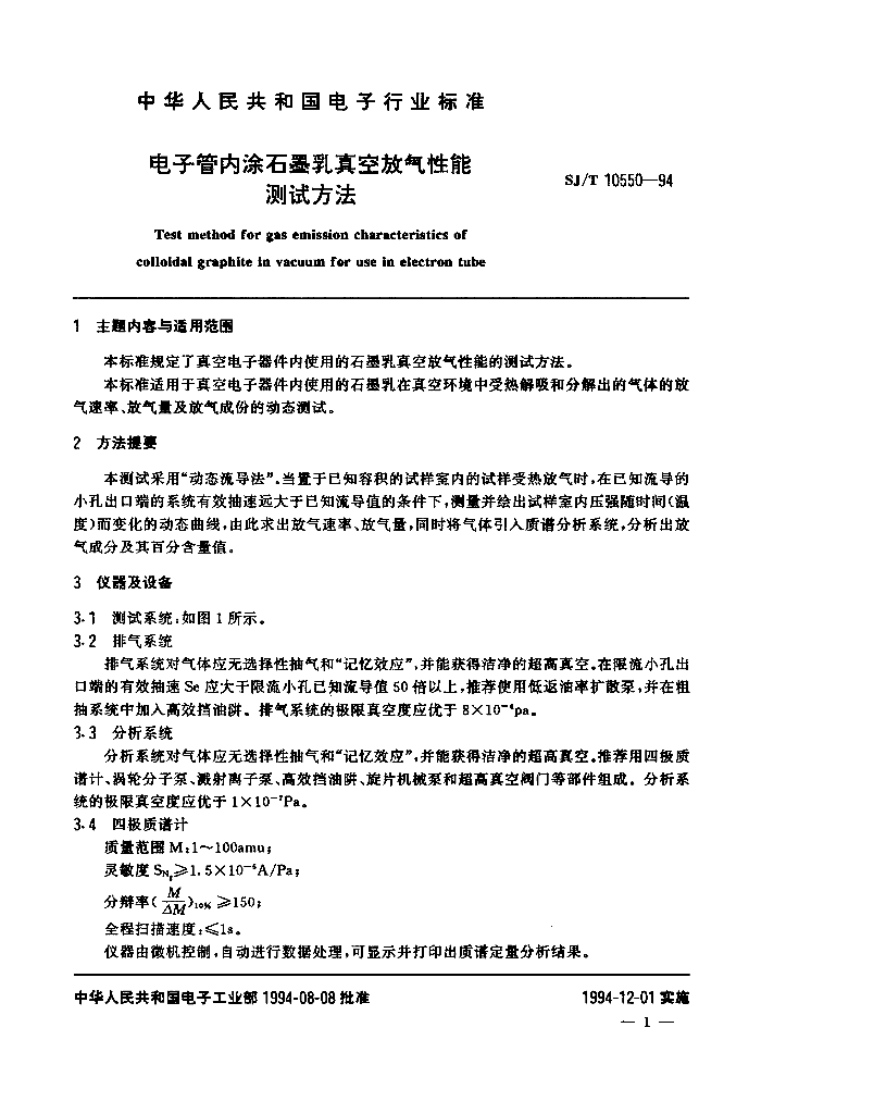 SJ/T 10550-1994 电子管内涂石墨乳真空放气性能测试方法