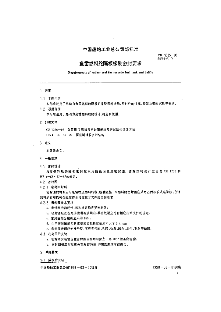 CB 1335-1998 鱼雷燃料舱隔板橡胶密封要求