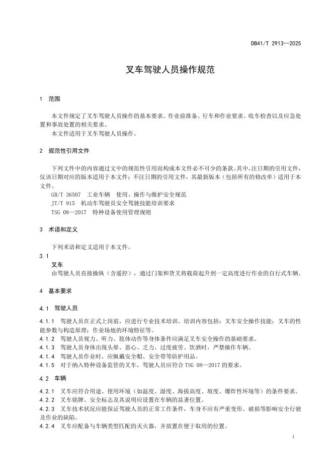DB41/T 2913-2025 叉车驾驶人员操作规范