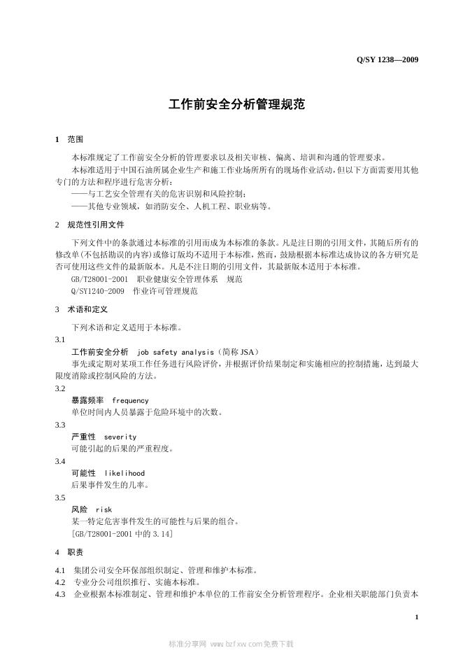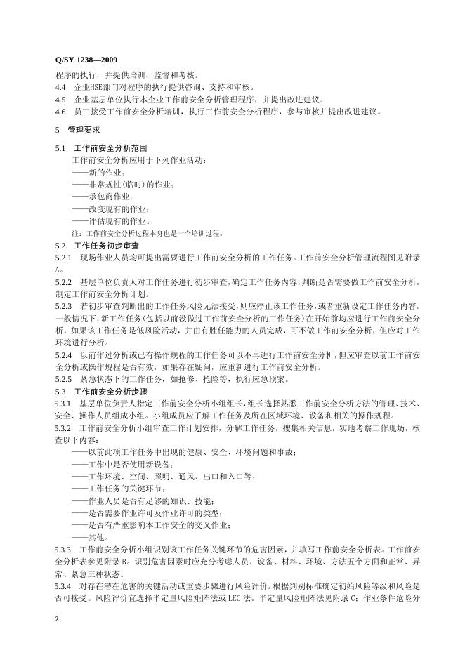 Q/SY 1238-2009 工作前安全分析JSA管理规范