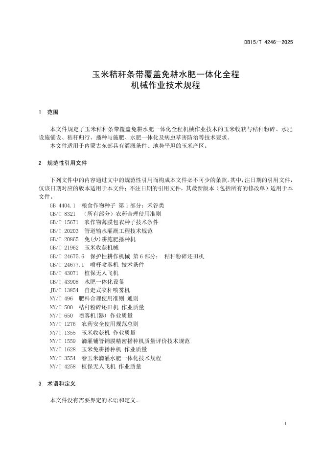 DB15/T 4246-2025 玉米秸秆条带覆盖免耕水肥一体化全程机械作业技术规程