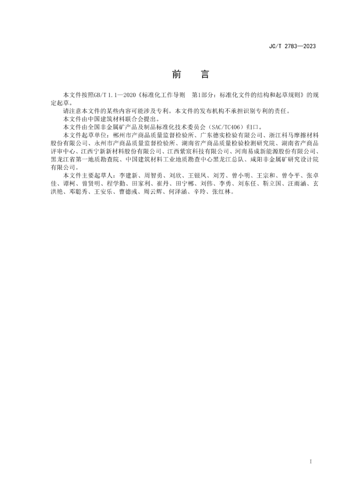 郴州市产商品质量监督检验所、广东德实检验有限公司、浙江科马摩擦材料股份有限公司、永州市产商品质量监督检验所、湖南省产商品质量检验检测研究院、湖南省产商品评审中心、江西宁新新材料股份有限公司、江西紫宸科技有限公司、河南易成新能源股份有限公司、黑龙江省第一地质勘查院、中国建筑材料工业地质勘查中心黑龙江总队、咸阳非金属矿研究设计院有限公司