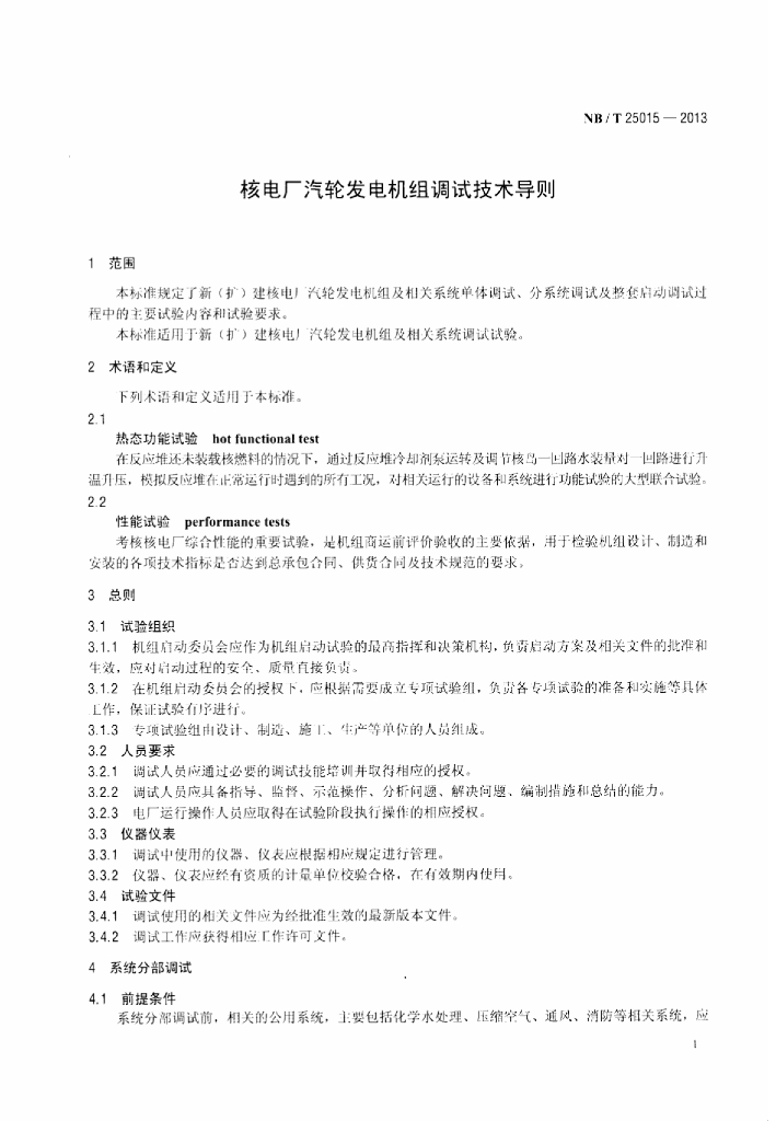 NB/T 25015-2013 核电厂汽轮发电机组调试技术导则