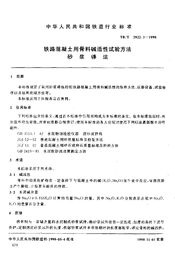 TB/T 2922.3-1998 铁路混凝土用骨料碱活性试验方法砂浆棒法