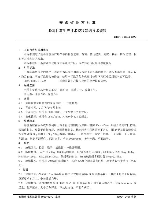DB34/T 185.2-1999 脱毒甘薯生产技术规程栽培技术规程