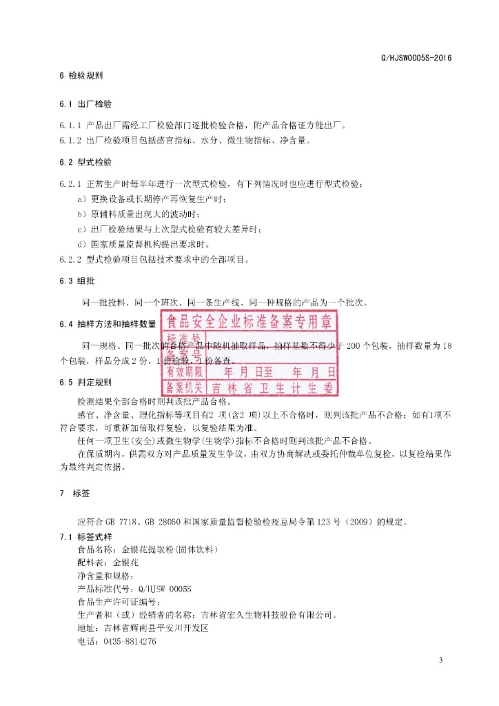 Q/HJSW 0005 S2016 吉林省宏久生物科技股份有限公司 金银花提取粉(固体饮料)