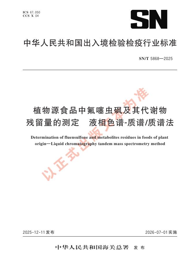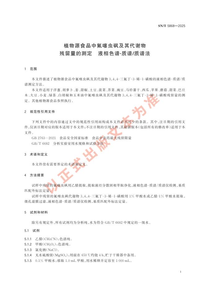 SN/T 5868-2025 植物源食品中氟噻虫砜及其代谢物残留量的测定 液相色谱-质谱/质谱法
