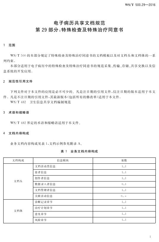 WS/T 500.29-2016 电子病历共享文档规范 第29部分:特殊检查及特殊治疗同意书