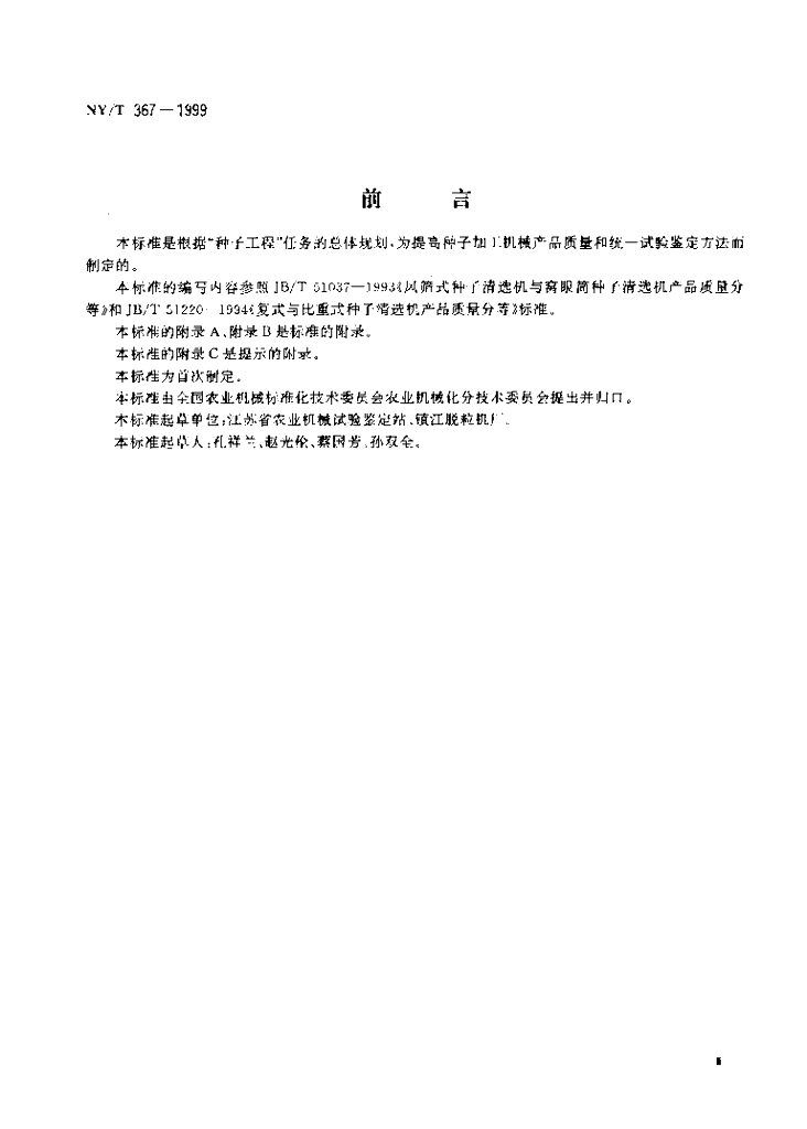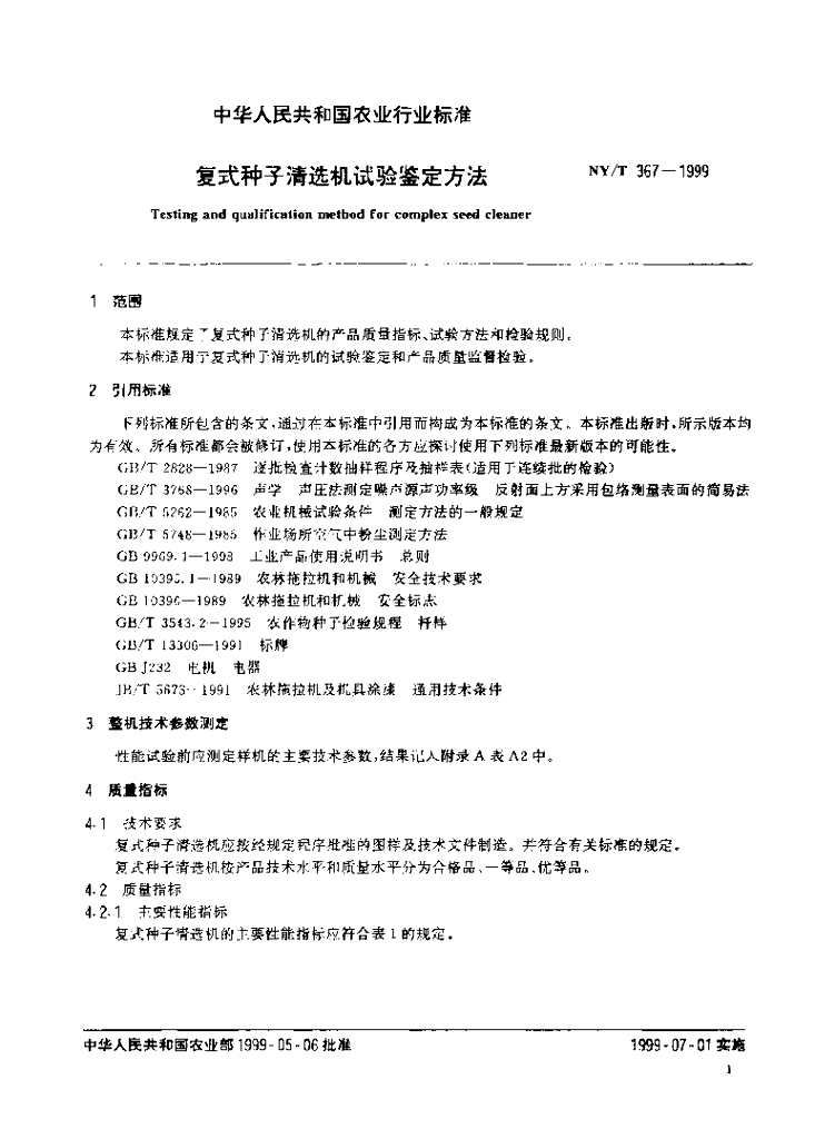 NY/T 367-1999 复式种子清选机试验鉴定方法