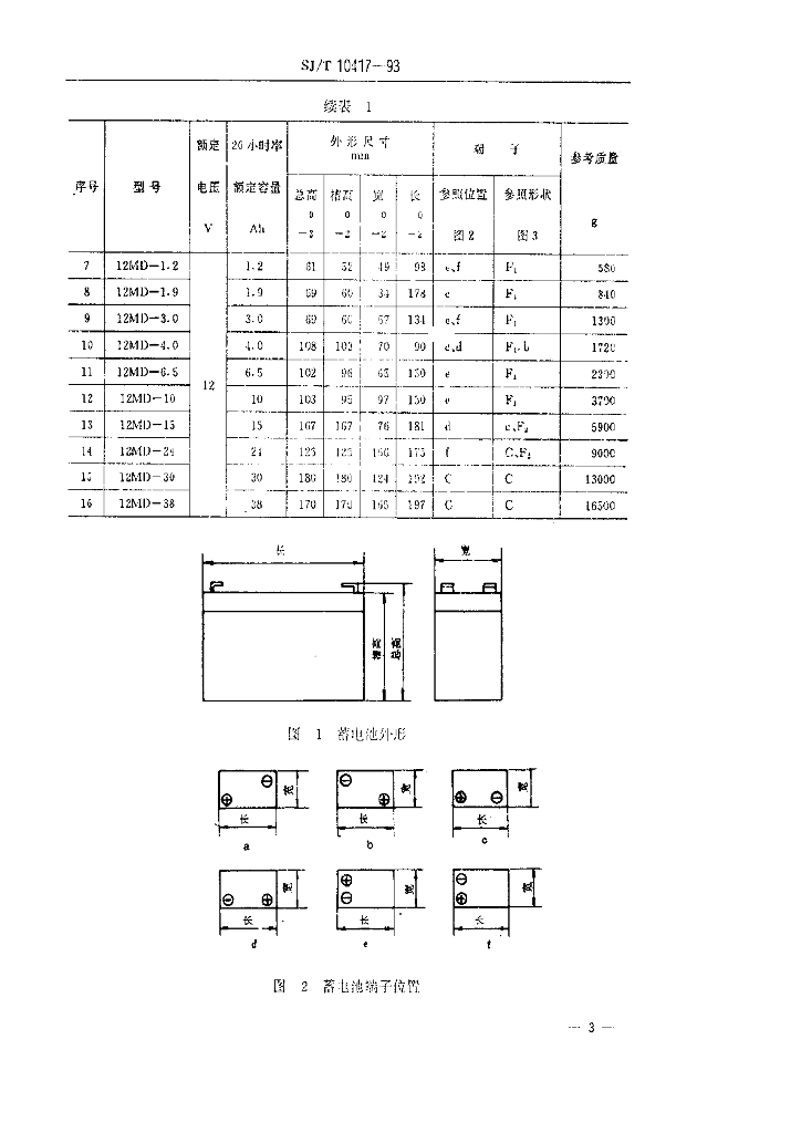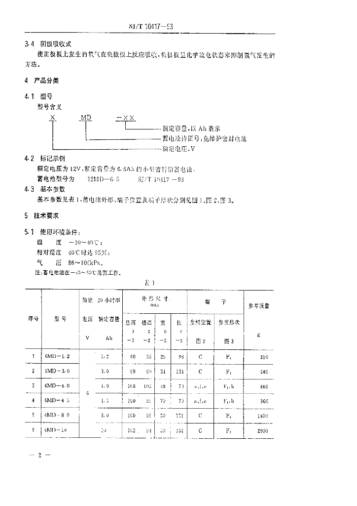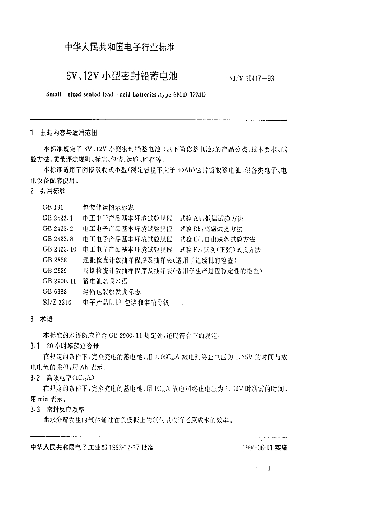 SJ/T 10417-1993 6V、12V小型密封铅蓄电池
