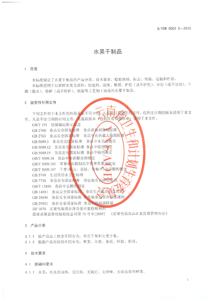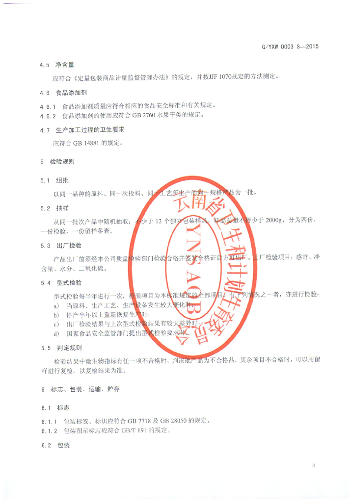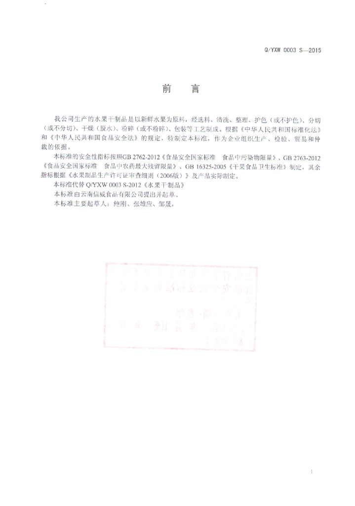 Q/YXW 0003S-2015 云南信威食品有限公司 水果干制品
