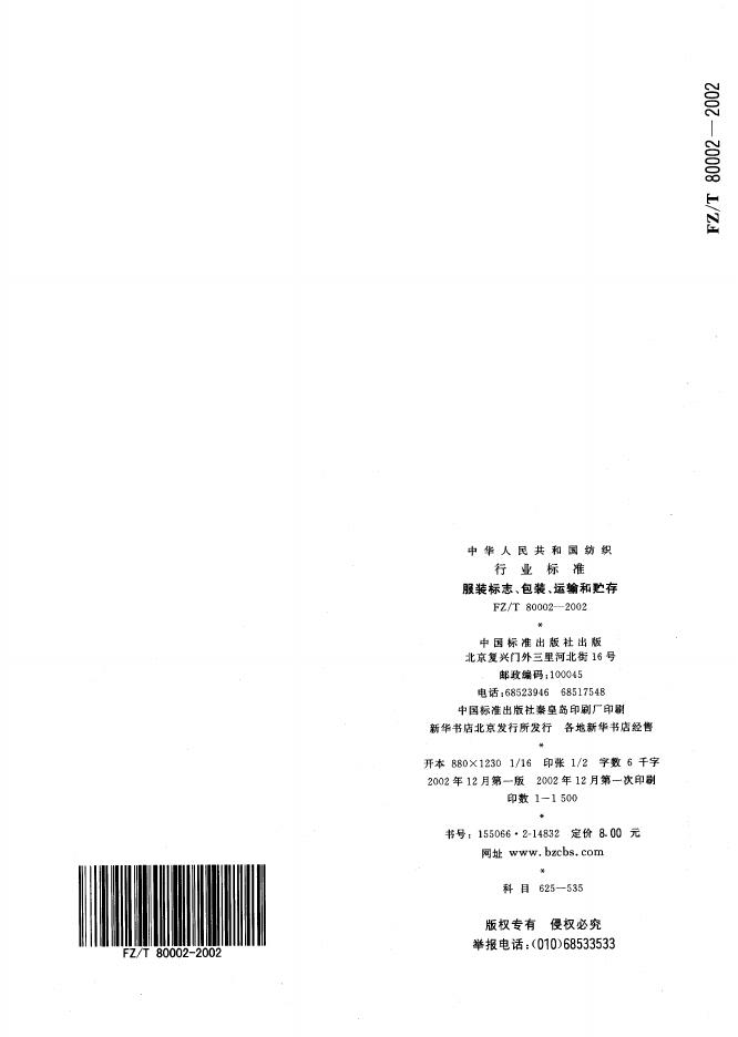 FZ/T 80002-1991 服装标志、包装、运输和储存