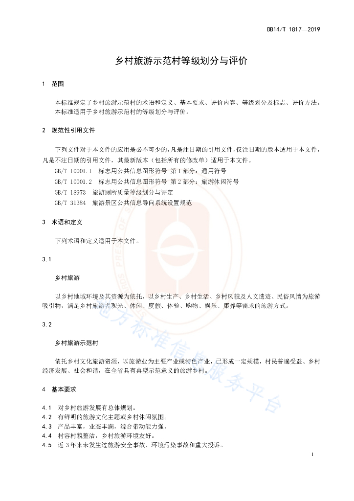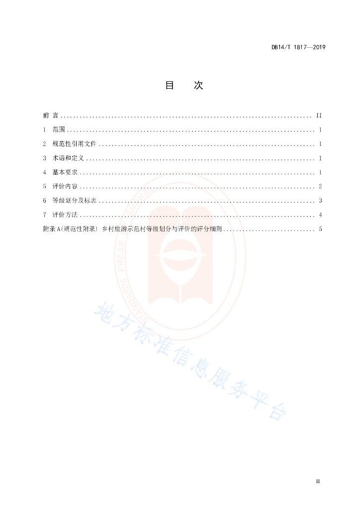 DB14/T 1817-2019 乡村旅游示范村等级划分与评价