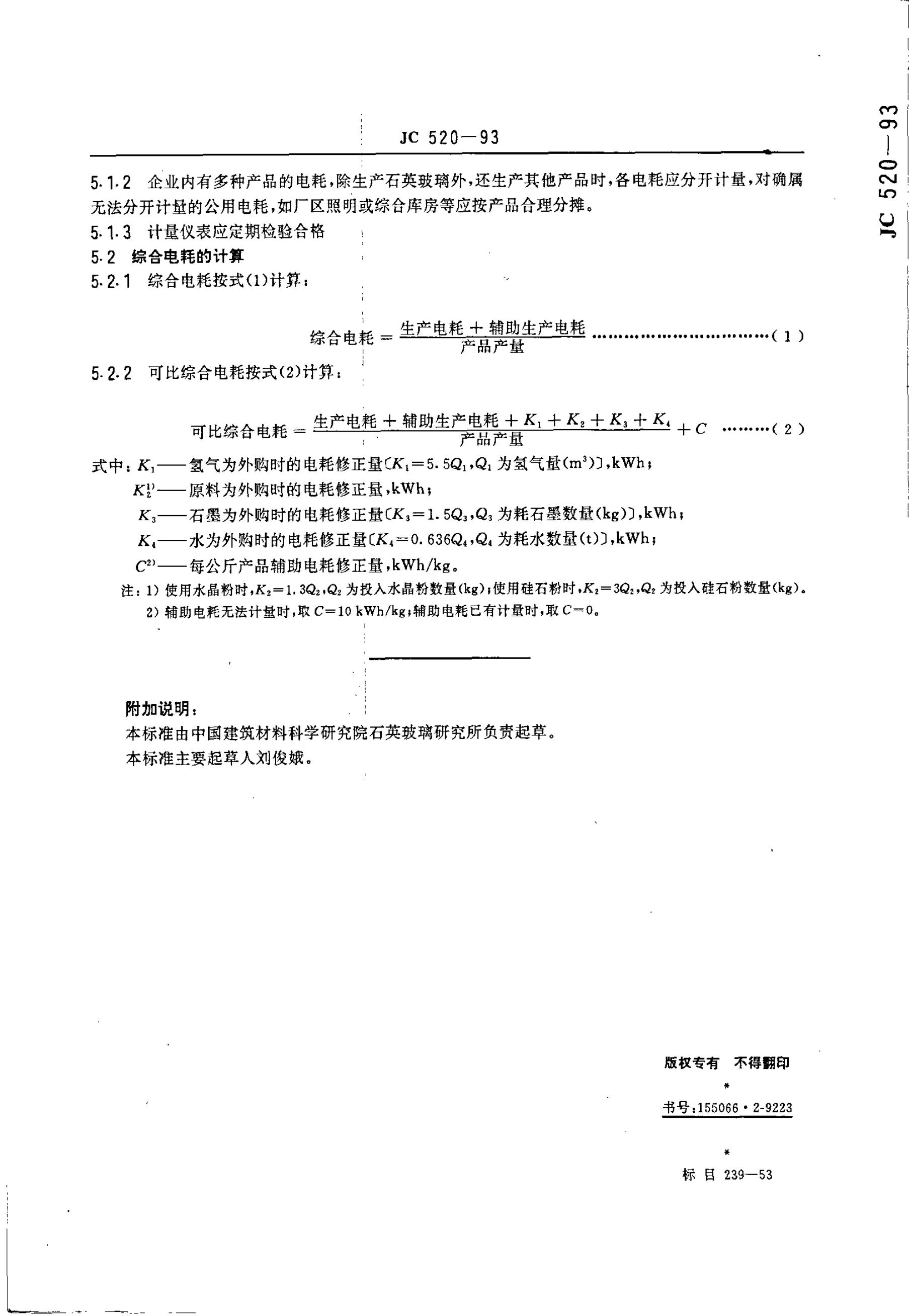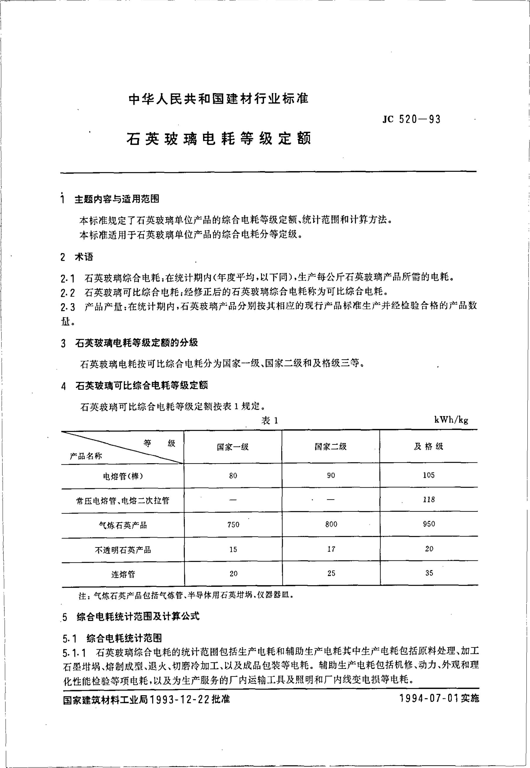 JC 520-1993 石英玻璃电耗等级定额