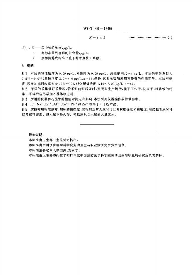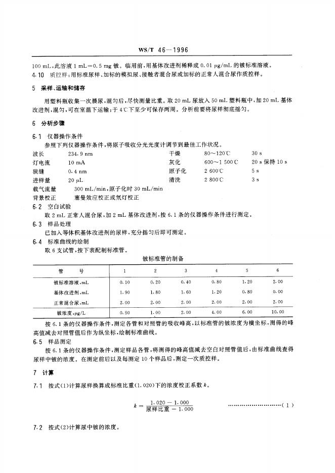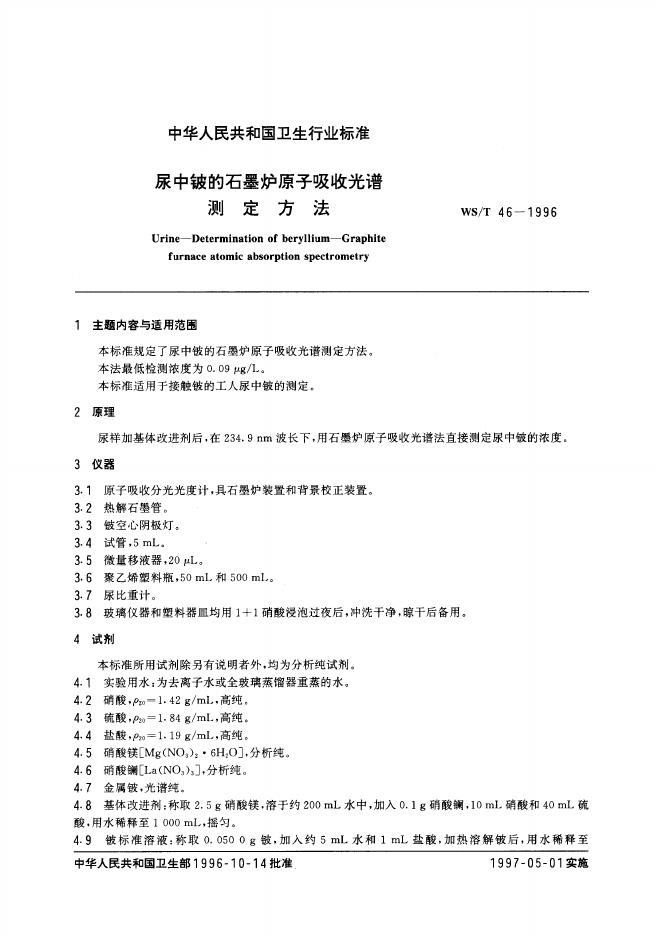 WS/T 46-1996 尿中铍的石墨炉原子吸收光谱测定方法