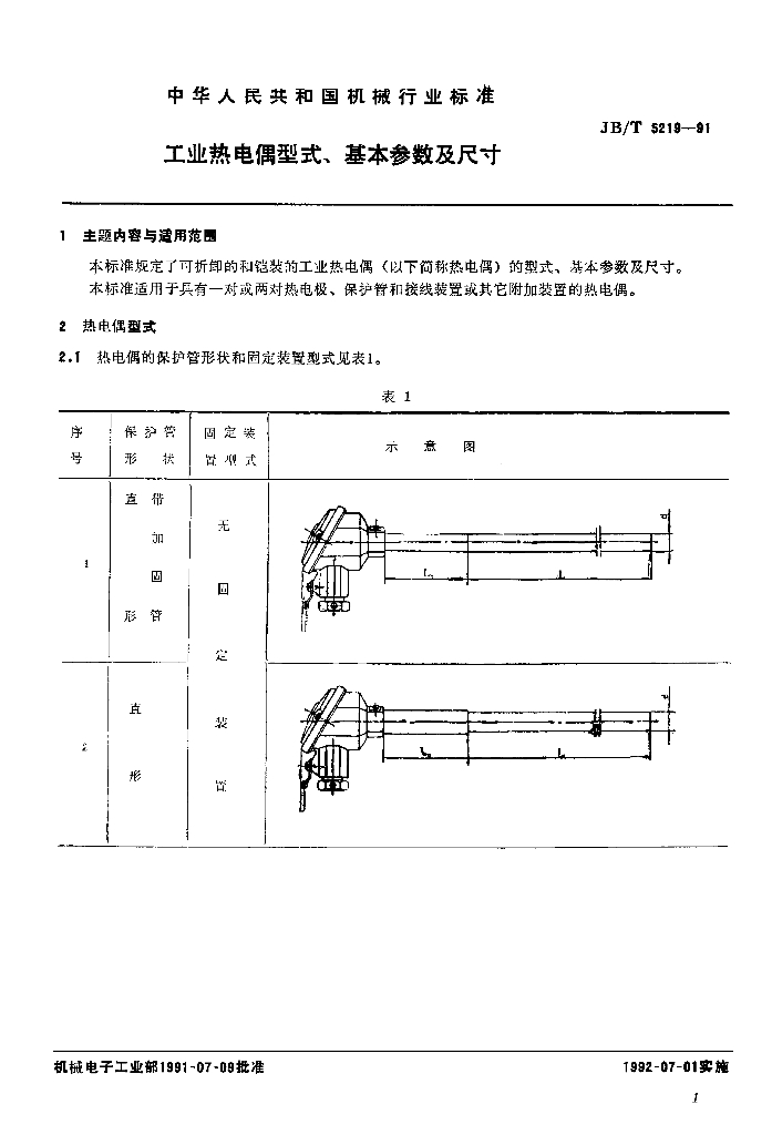 JB/T 5219-1991 工业热电偶 型式、基本参数及