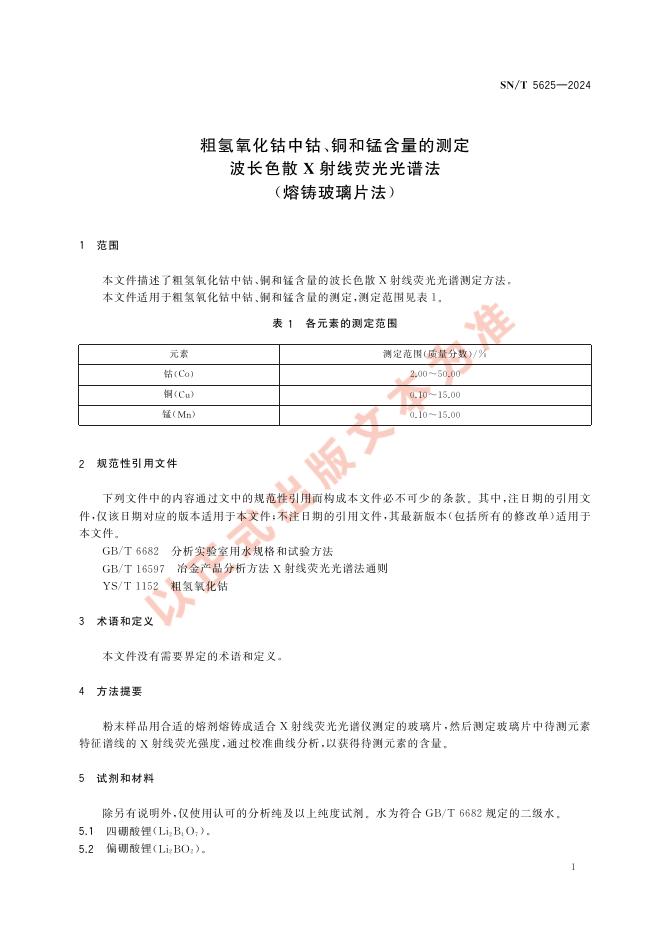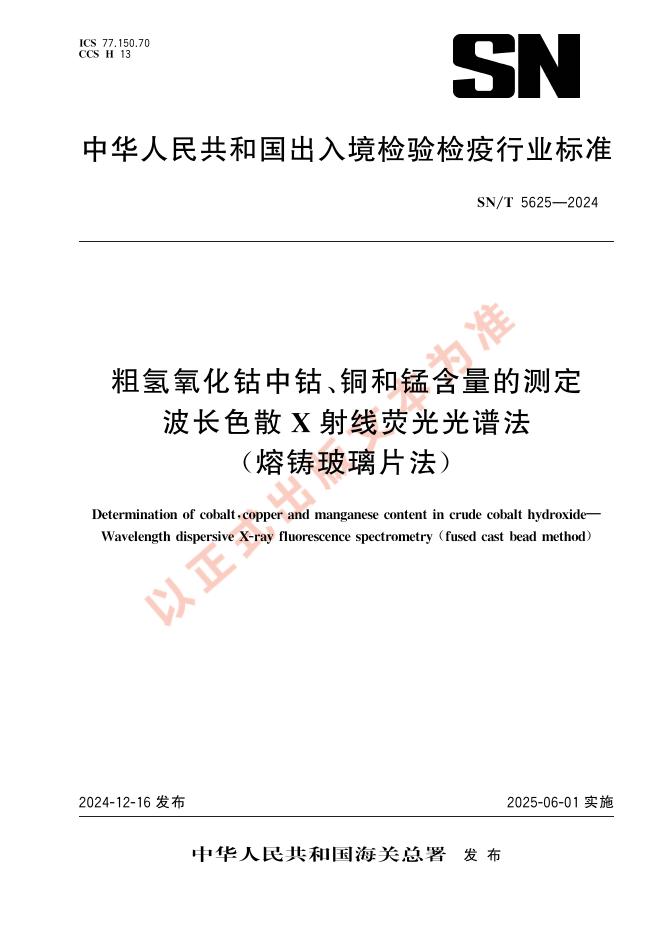 SN/T 5625-2024 粗氢氧化钴中钴、铜和锰含量的测定 波长色散X射线荧光光谱法(熔铸玻璃片法)