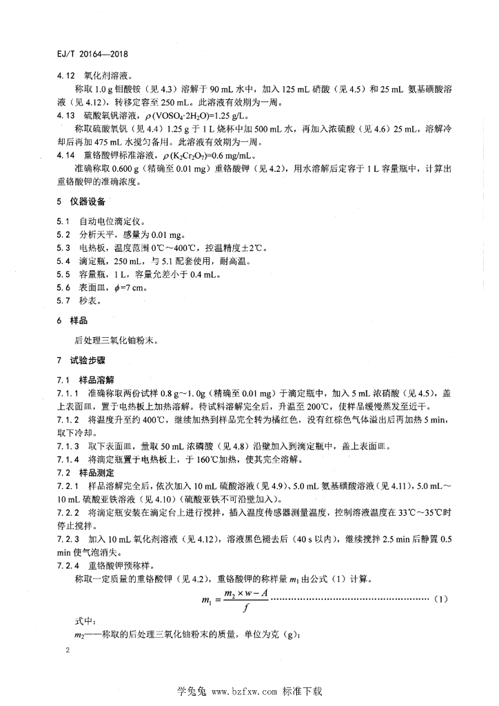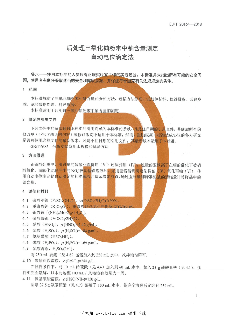 EJ/T 20164-2018 后处理三氧化铀粉末中铀含量测定 自动电位滴定法