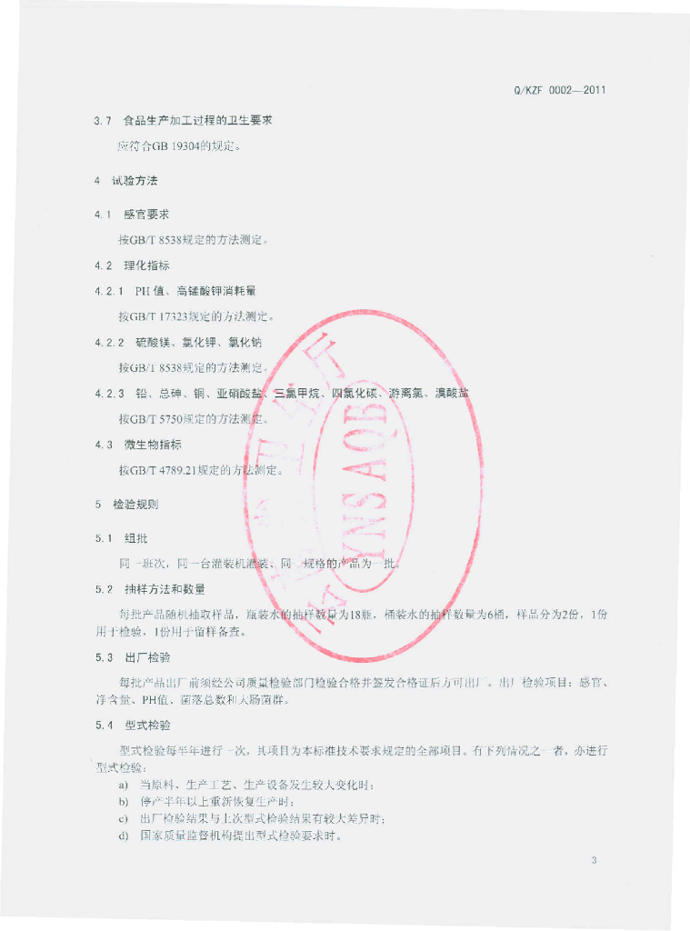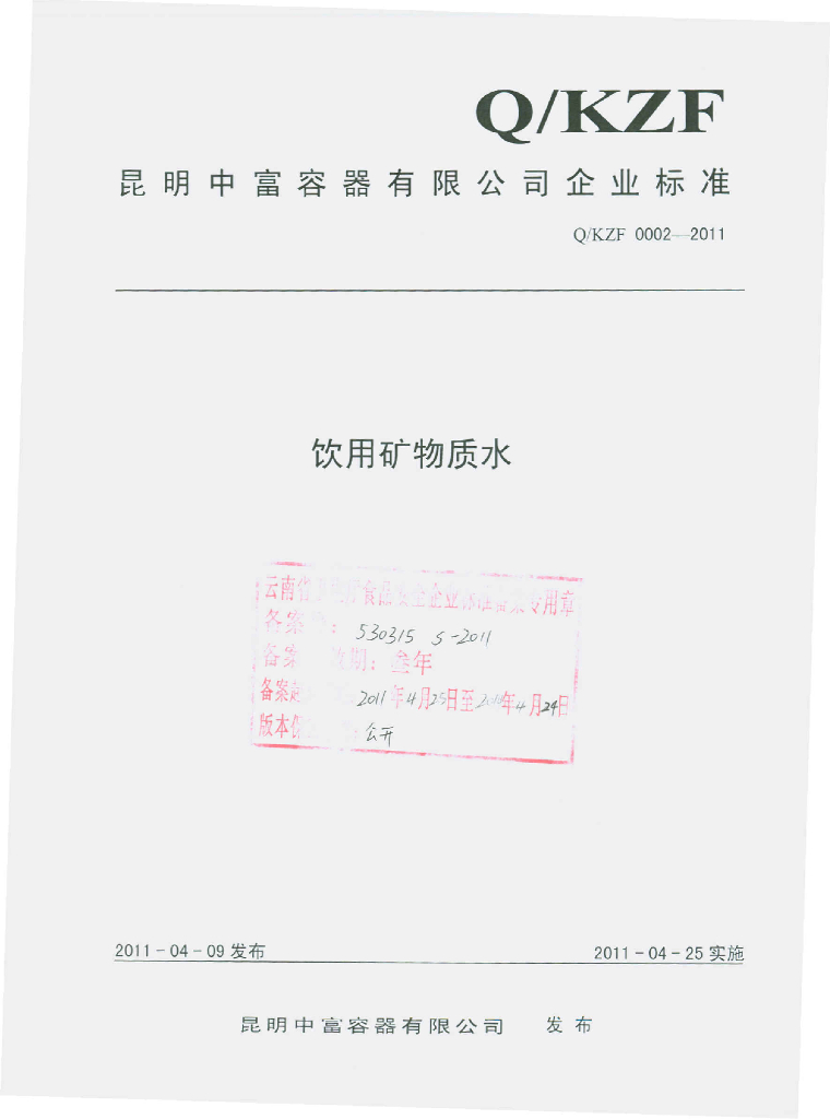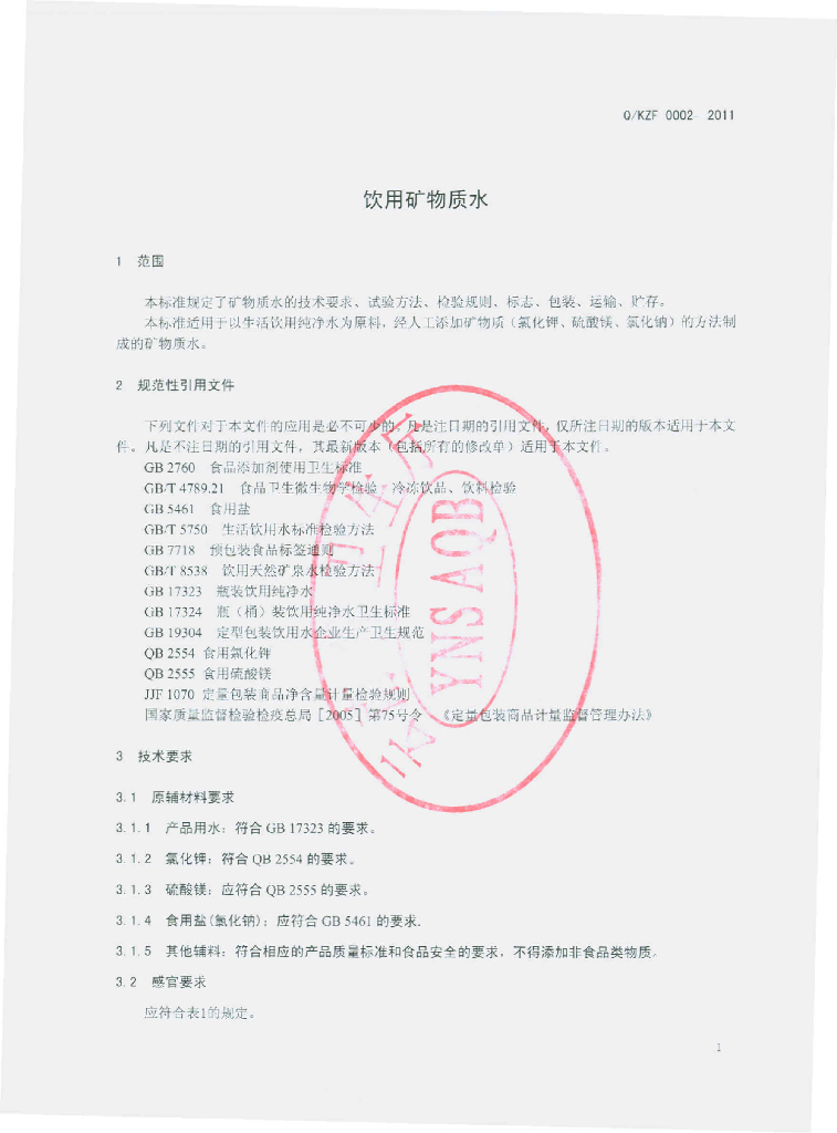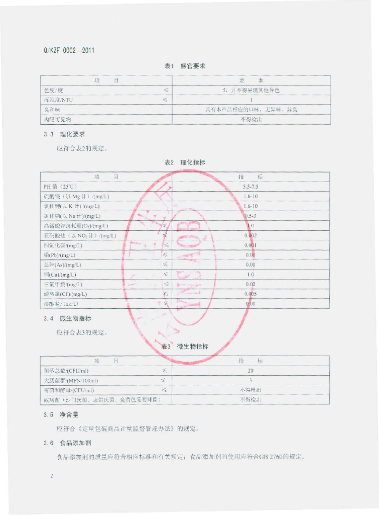Q/KZF 0002-2011 饮用矿物质水