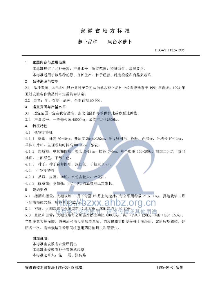DB34/T 112.5-1995 萝卜品种 凤台水萝卜