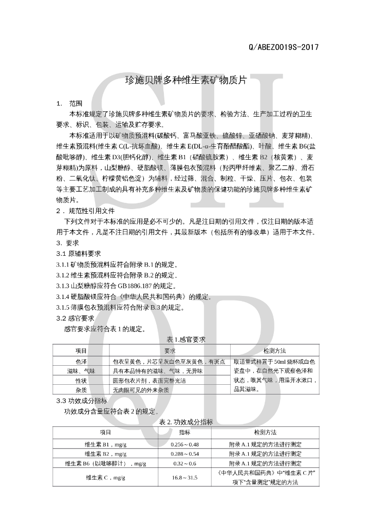 Q/ABEZ 0019S-2017 珍施贝牌多种维生素矿物质片