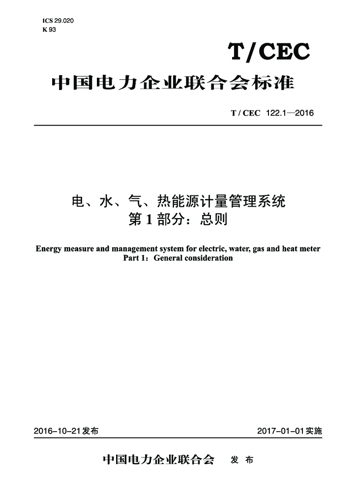 T/CEC 122.1-2016 电、水、气、热能源计量管理系统 第1部分:总则
