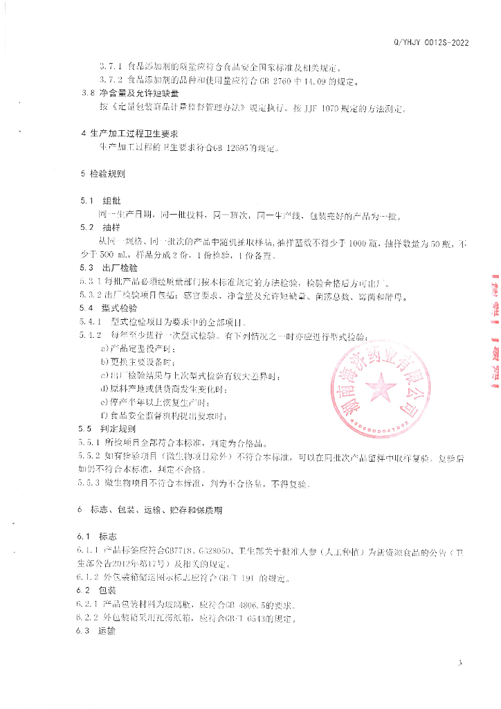 Q/YHJY 0012S-2022 人参蜂王浆饮料