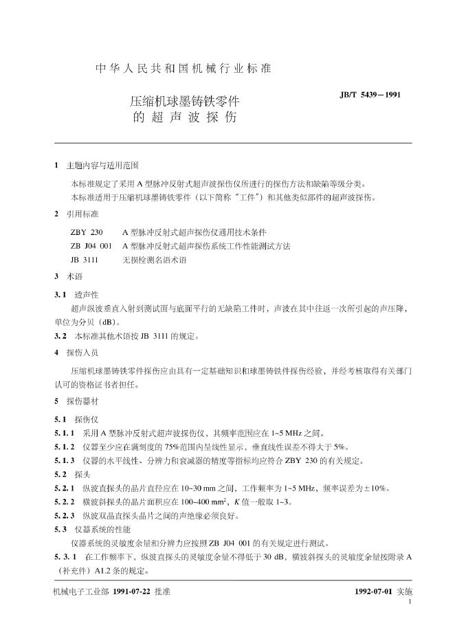 JB 5439-1991 压缩机球墨铸铁零部件的超声波探伤