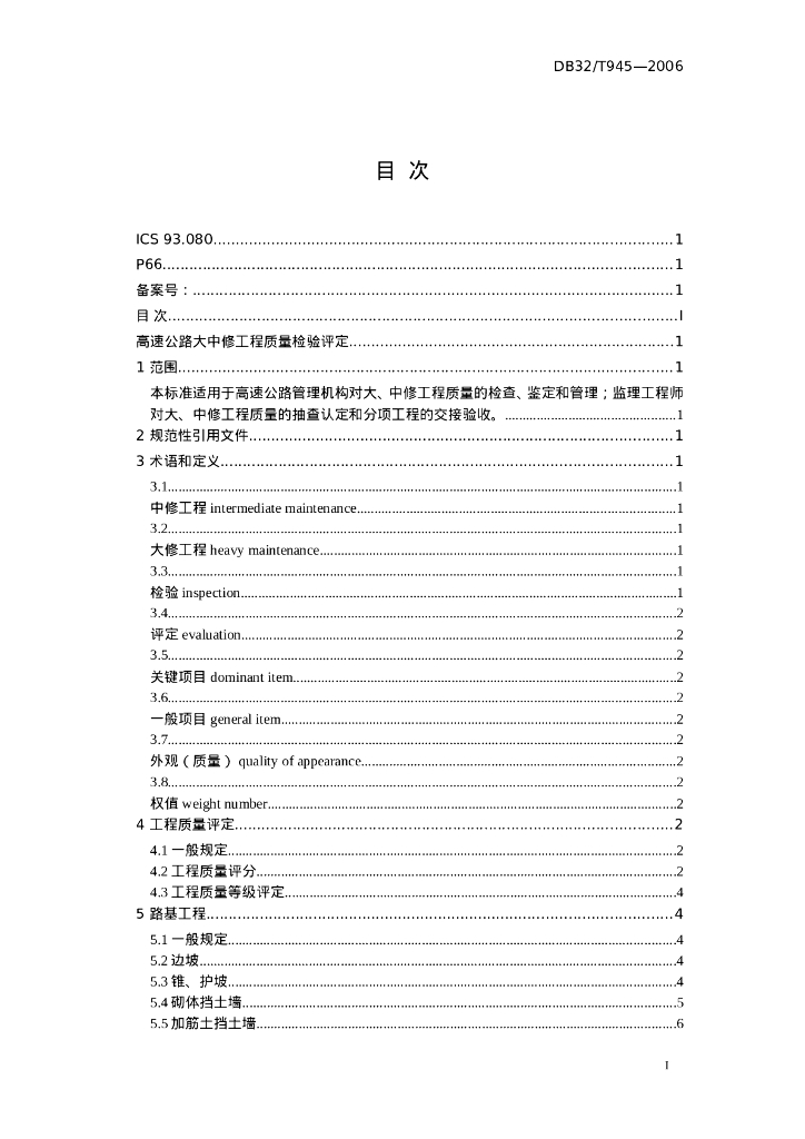 DB32/T 945-2006 高速公路大中修工程质量检验评定