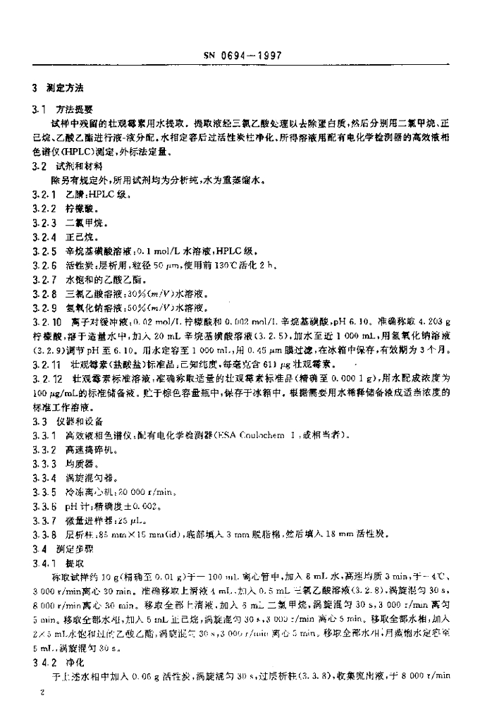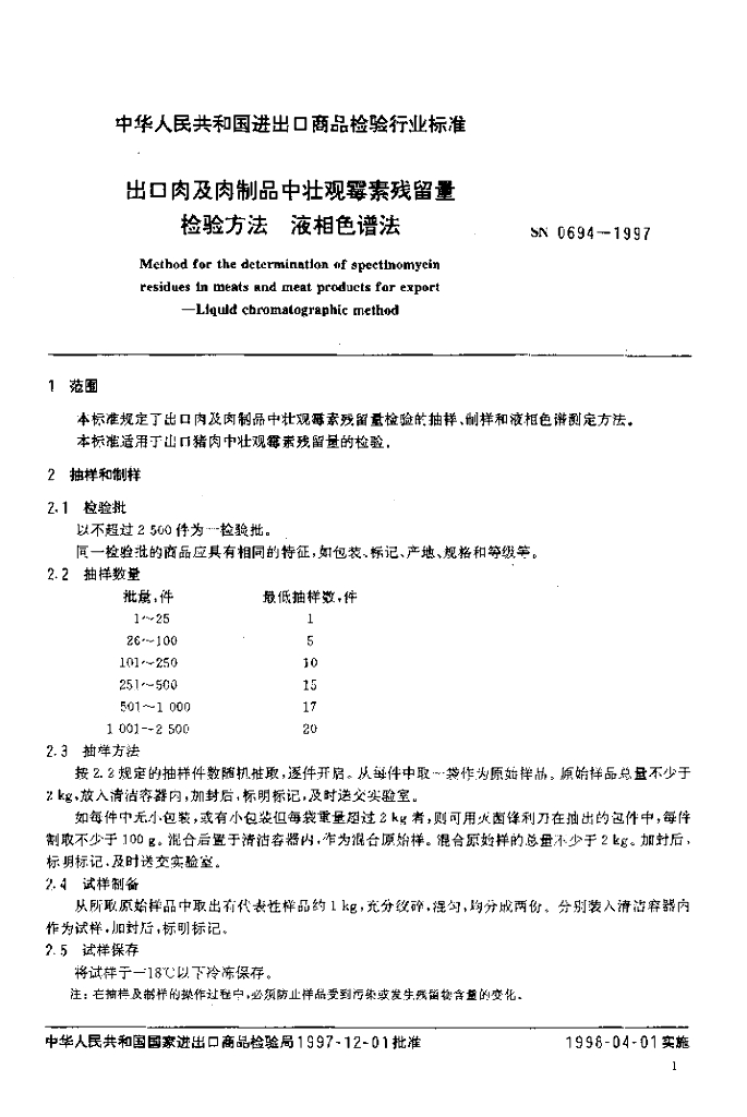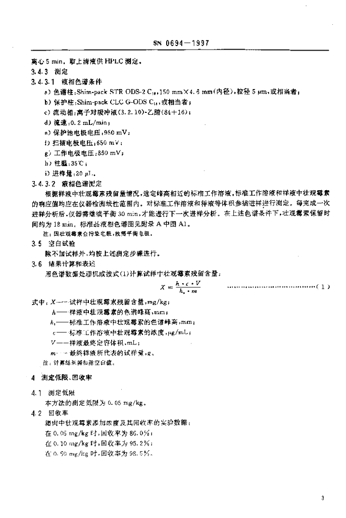SN 0694-1997 出口肉及肉制品中壮观霉素残留量检验方法 液相色谱法