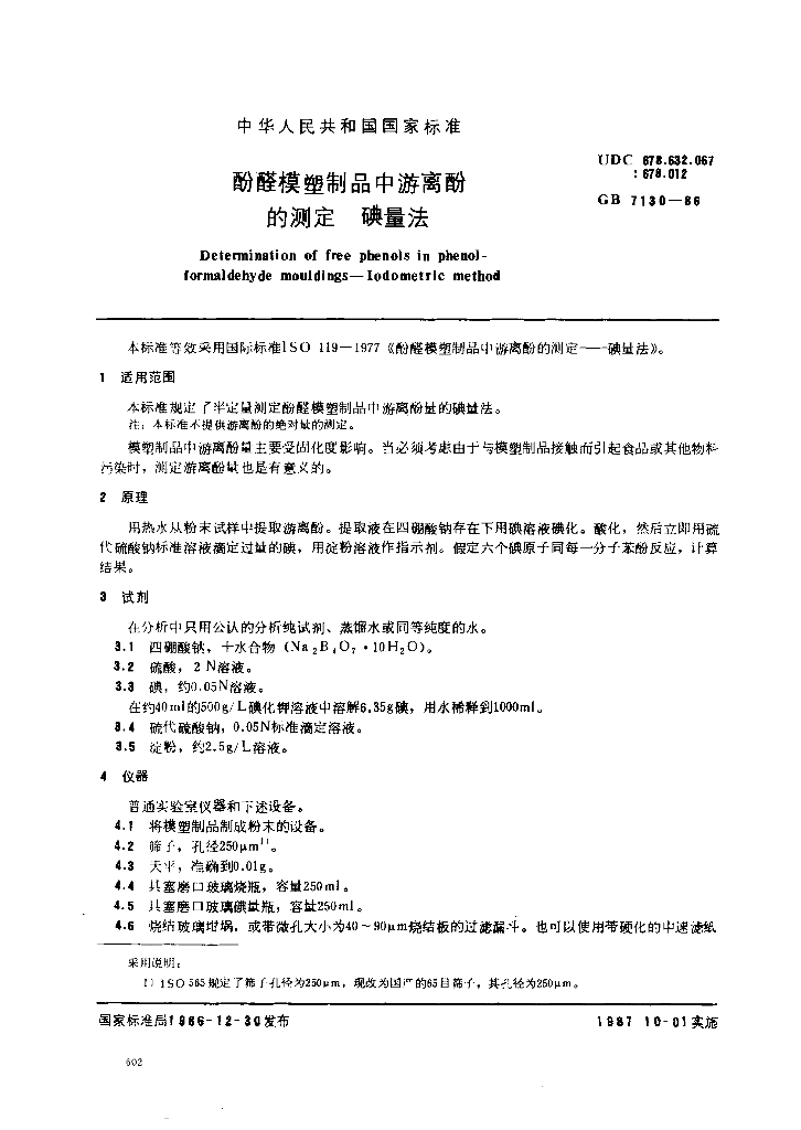 GB/T 7130-1986 酚醛模塑制品中游离酚的测定 碘量法