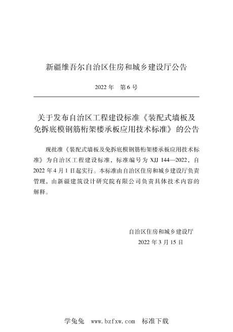 XJJ 144-2022 装配式墙板及免拆底模钢筋桁架楼承板应用技术标准